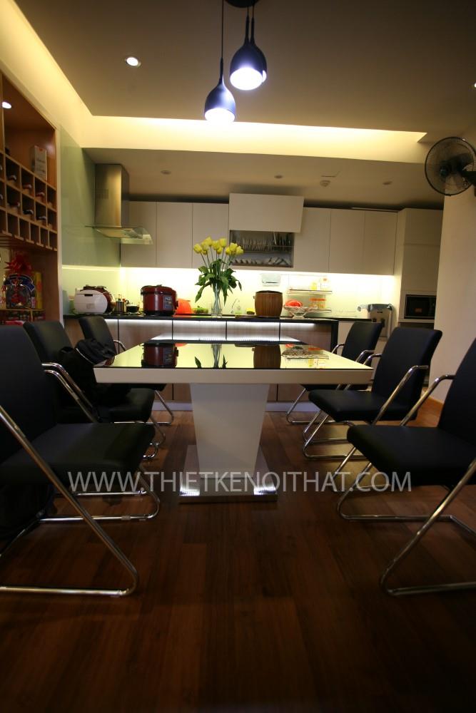 Tiếp theo là thiết kế nội thất khu phòng ăn hiện đại. Thiết kế bàn ăn gọn gàng với sáu ghế nhỏ giúp khôn gian trở nên linh hoạt và ấn tượng, phù hợp với cả các bữa cơm với bạn bè hay chỉ đơn giản là bữa tối với gia đình nhỏ. Tone màu mà kiến trúc sư sử dụng không quá nhiều, thiên về các tone màu sáng, nhẹ nhàng, tạo cảm giác cân đối về mặt màu sắc và đường nét.