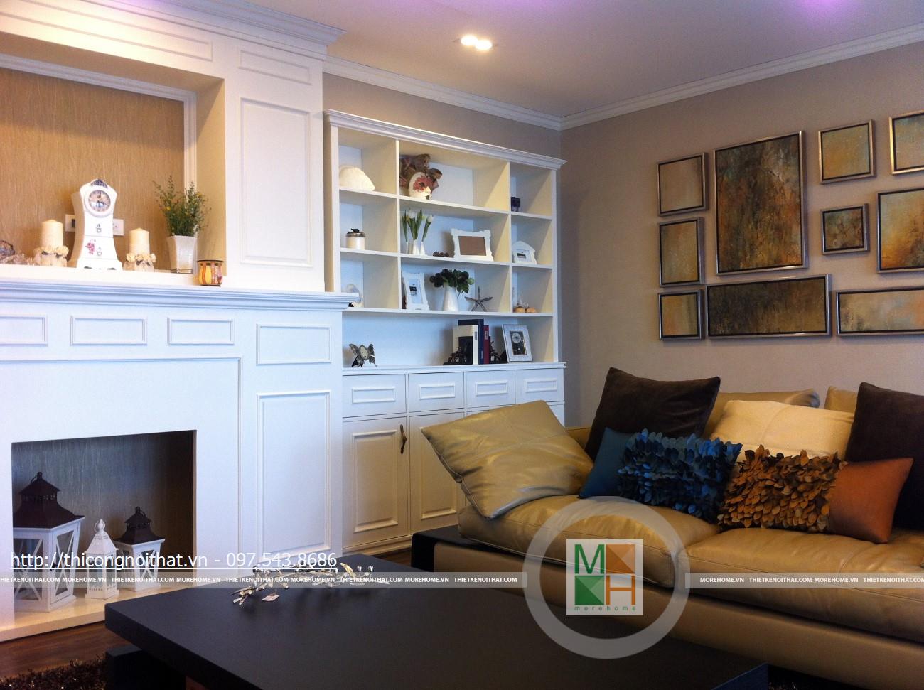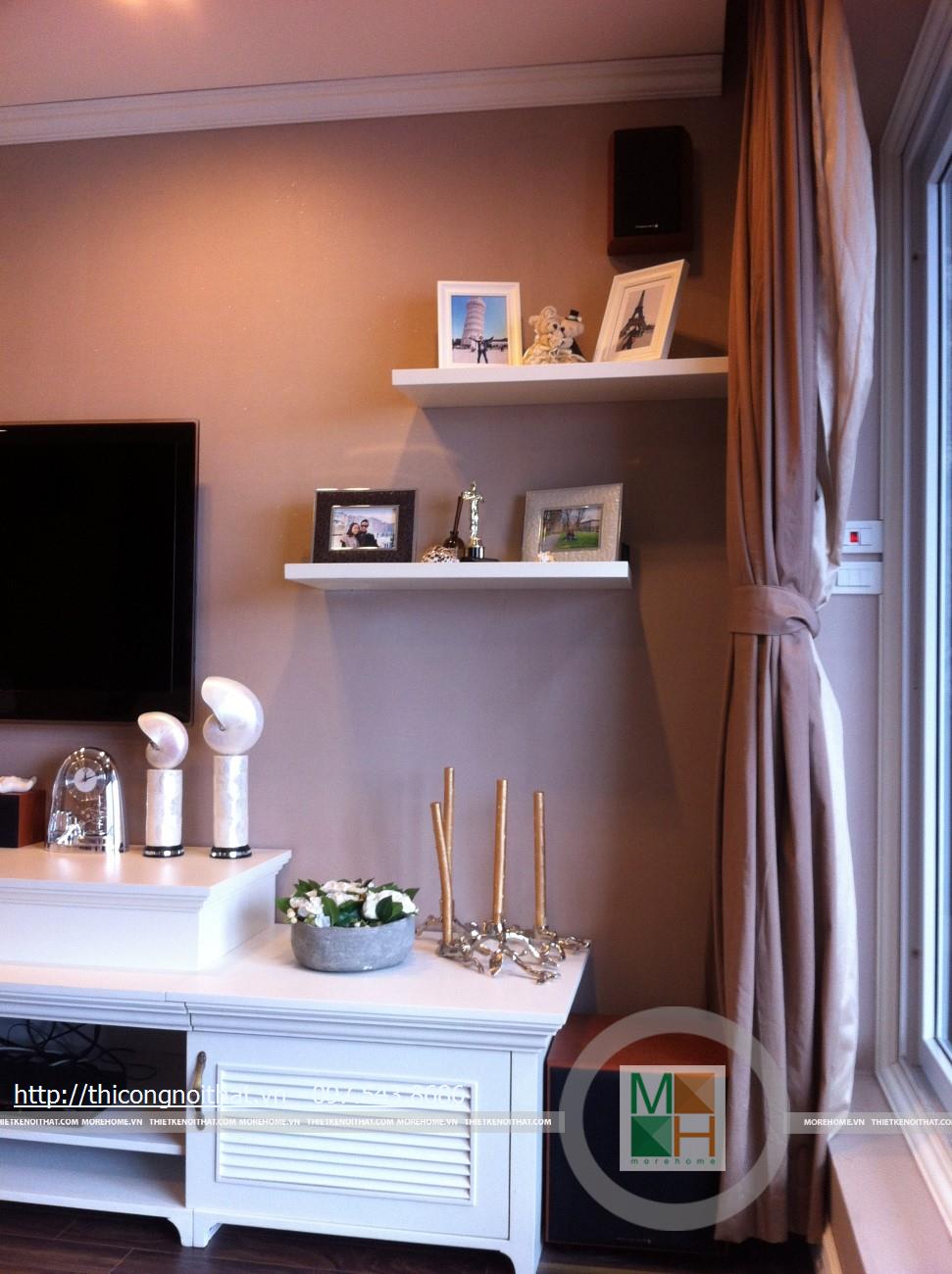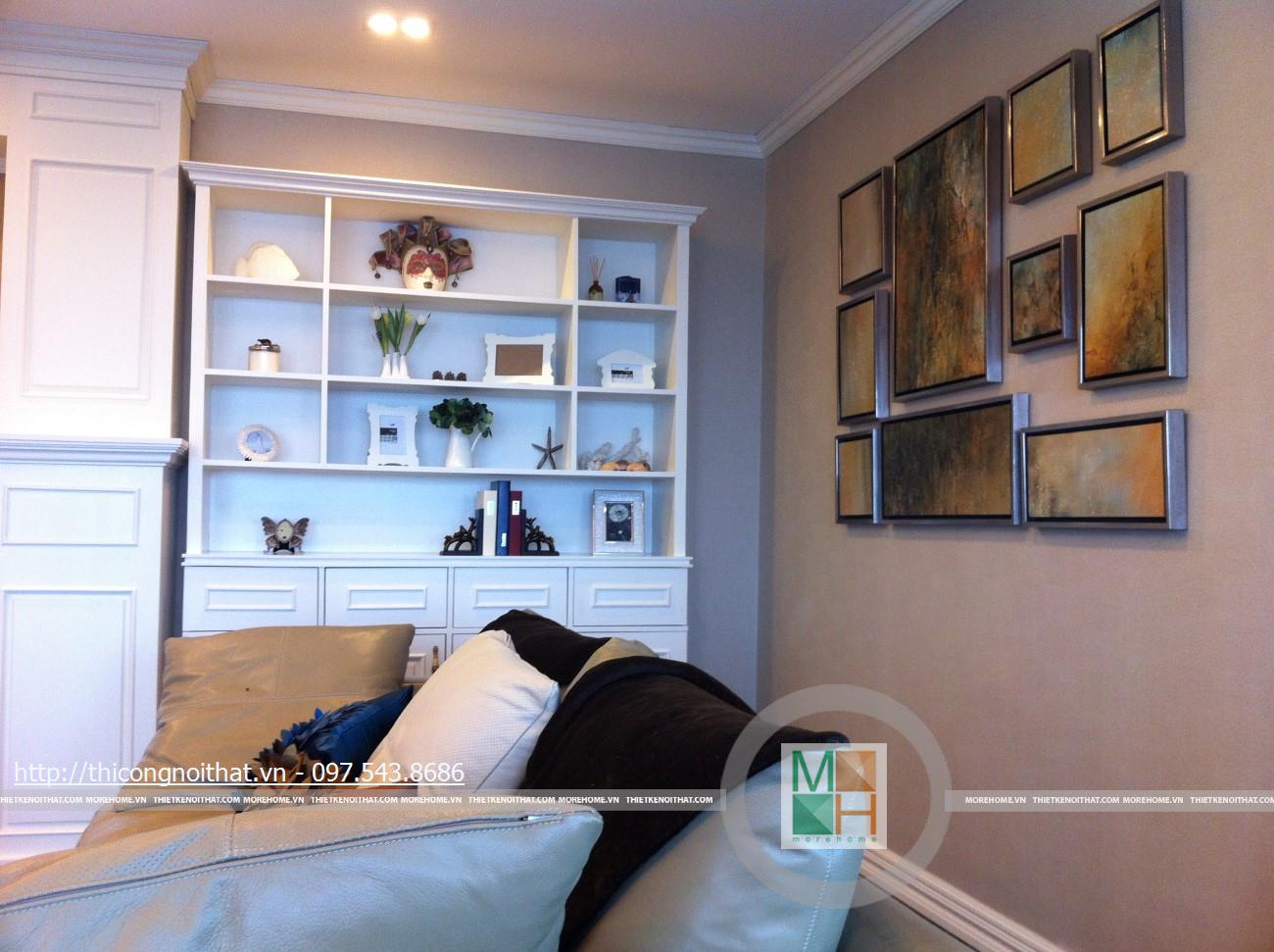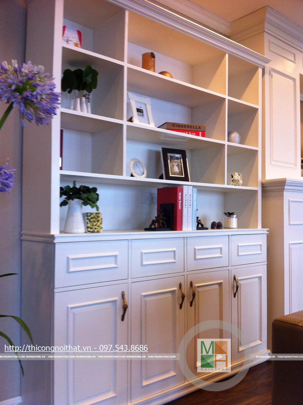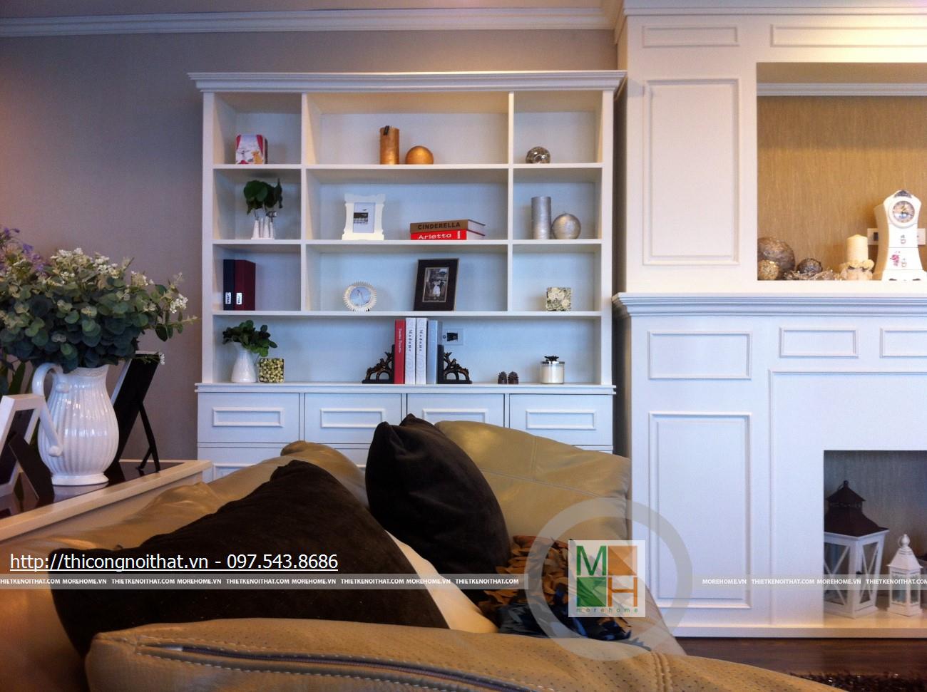 Hai bên chiếc tủ này là 2 kệ đựng đồ với những ngăn ô nhỏ giúp phân chia khu vực đặt đồ trang trí và ở dưới là ngăn tủ kín đựng các vật dụng không muốn trưng bày ra ngoài. Ngay cạnh chiếc ghế bành sofa dài là chiếc bàn trắng nhỏ trên có đặt lọ hoa xinh xắn với các bức tranh lưu niệm. Toát lên trên toàn bộ phòng khách là màu trắng tinh khôi song được tạo điểm nhấn bởi màu sắc của hoa, của bàn ghế, của những chiếc gối ôm.