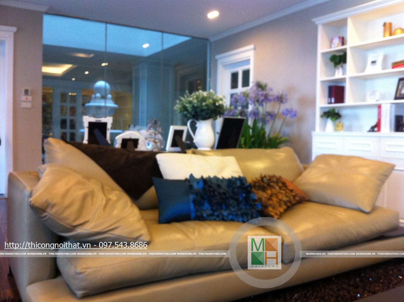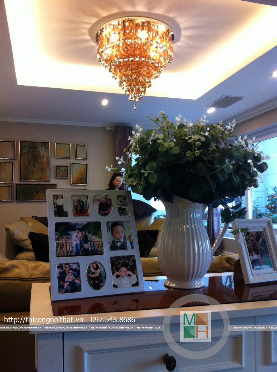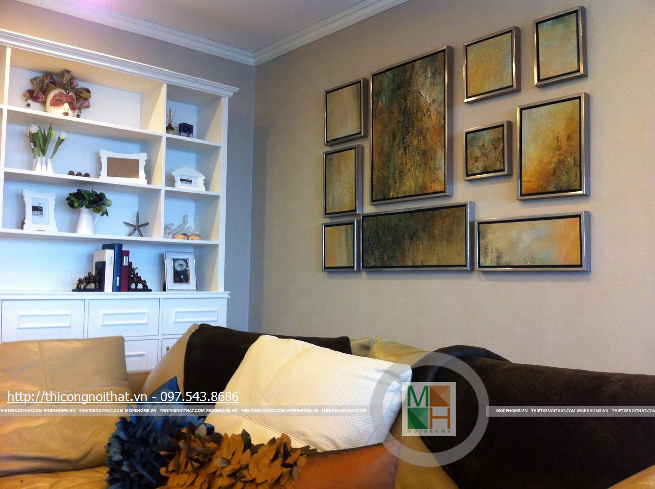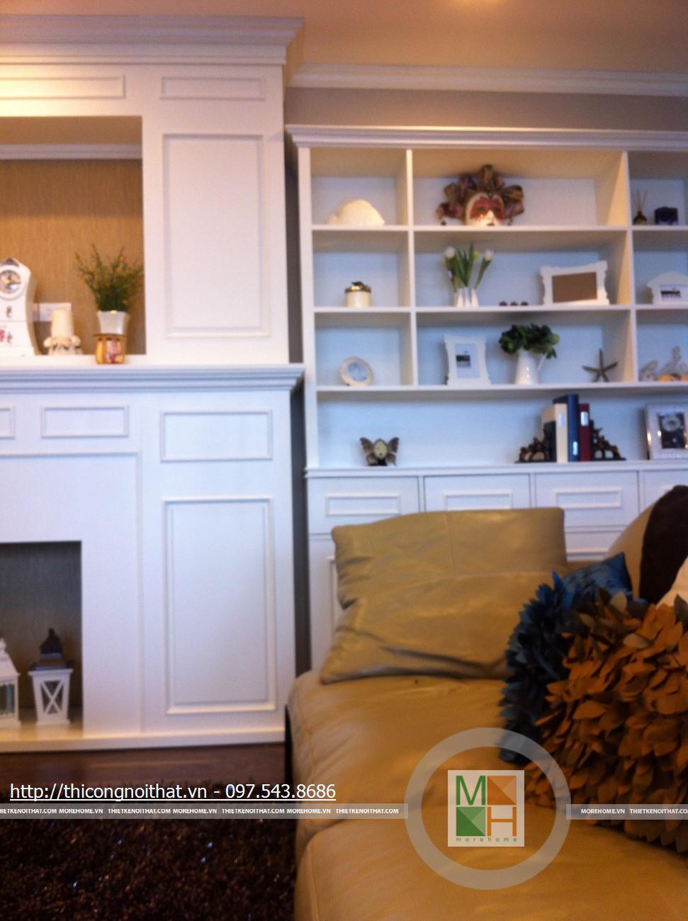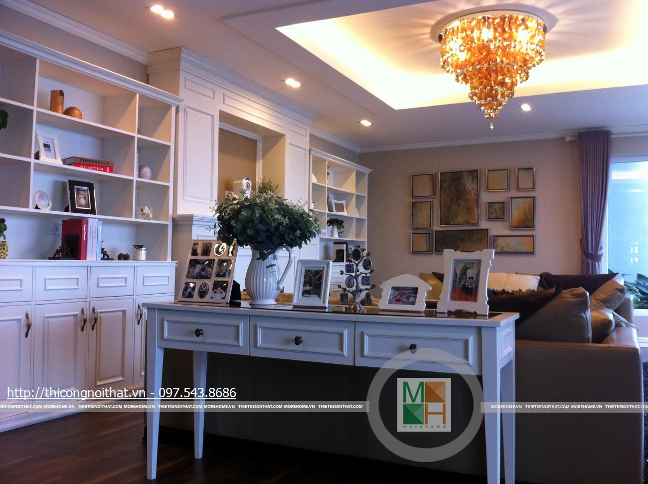 Hai bên chiếc tủ này là 2 kệ đựng đồ với những ngăn ô nhỏ giúp phân chia khu vực đặt đồ trang trí và ở dưới là ngăn tủ kín đựng các vật dụng không muốn trưng bày ra ngoài. Ngay cạnh chiếc ghế bành sofa dài là chiếc bàn trắng nhỏ trên có đặt lọ hoa xinh xắn với các bức tranh lưu niệm. Toát lên trên toàn bộ phòng khách là màu trắng tinh khôi song được tạo điểm nhấn bởi màu sắc của hoa, của bàn ghế, của những chiếc gối ôm.
