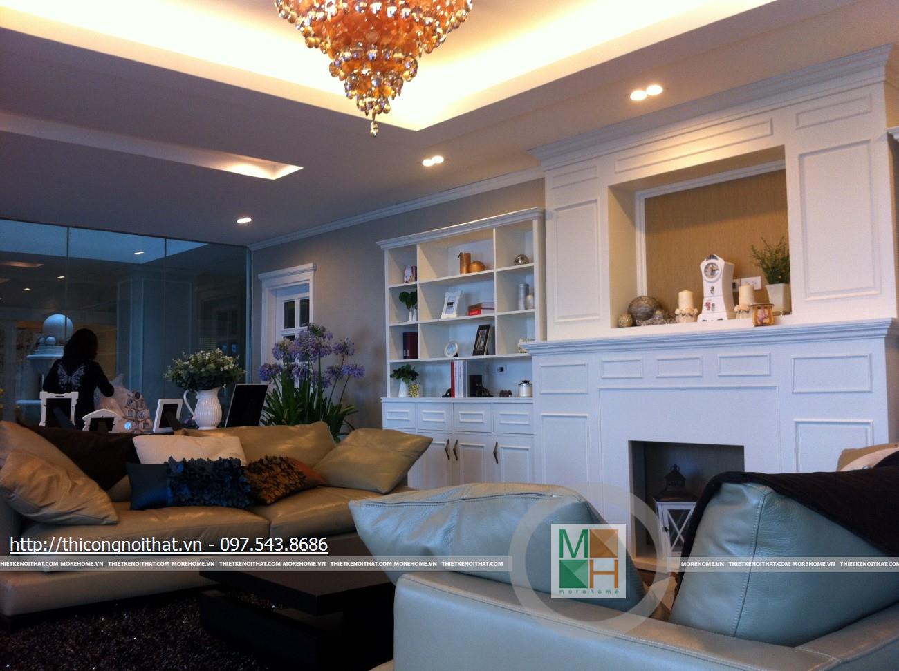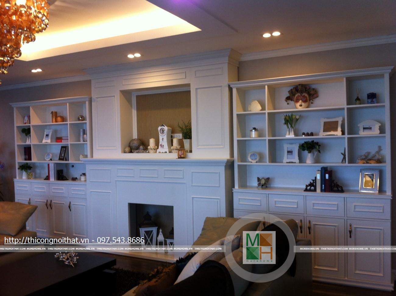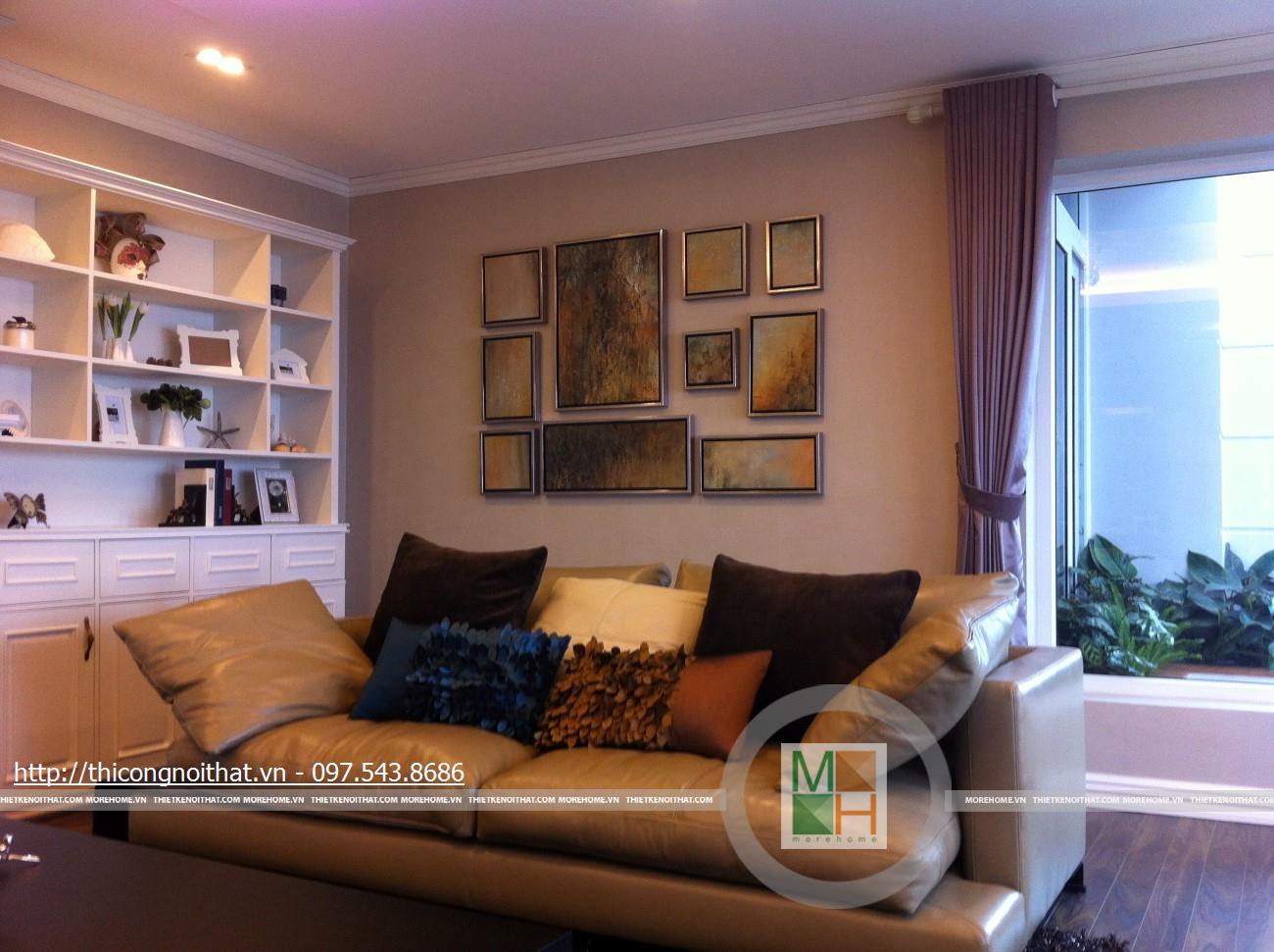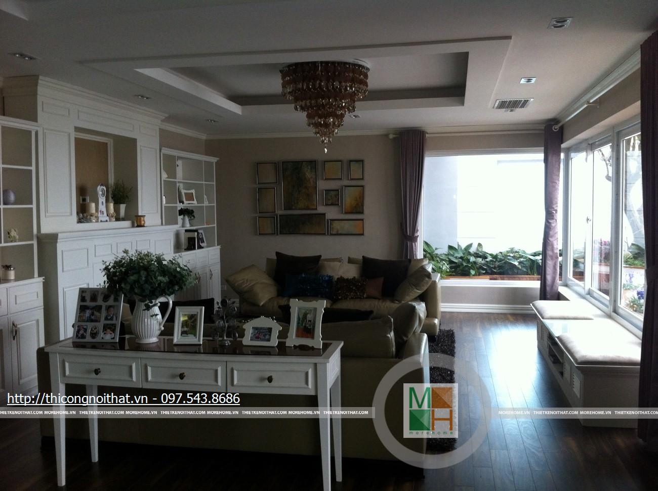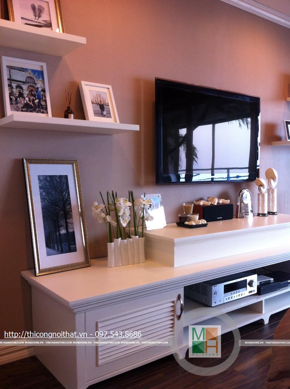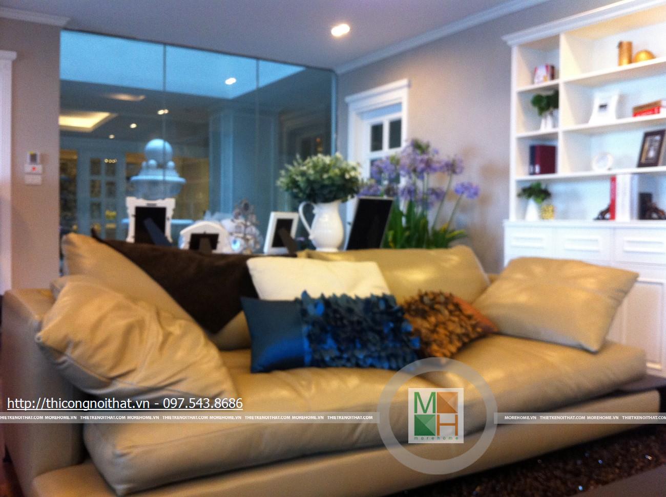Hai bên chiếc tủ này là 2 kệ đựng đồ với những ngăn ô nhỏ giúp phân chia khu vực đặt đồ trang trí và ở dưới là ngăn tủ kín đựng các vật dụng không muốn trưng bày ra ngoài. Ngay cạnh chiếc ghế bành sofa dài là chiếc bàn trắng nhỏ trên có đặt lọ hoa xinh xắn với các bức tranh lưu niệm. Toát lên trên toàn bộ phòng khách là màu trắng tinh khôi song được tạo điểm nhấn bởi màu sắc của hoa, của bàn ghế, của những chiếc gối ôm.