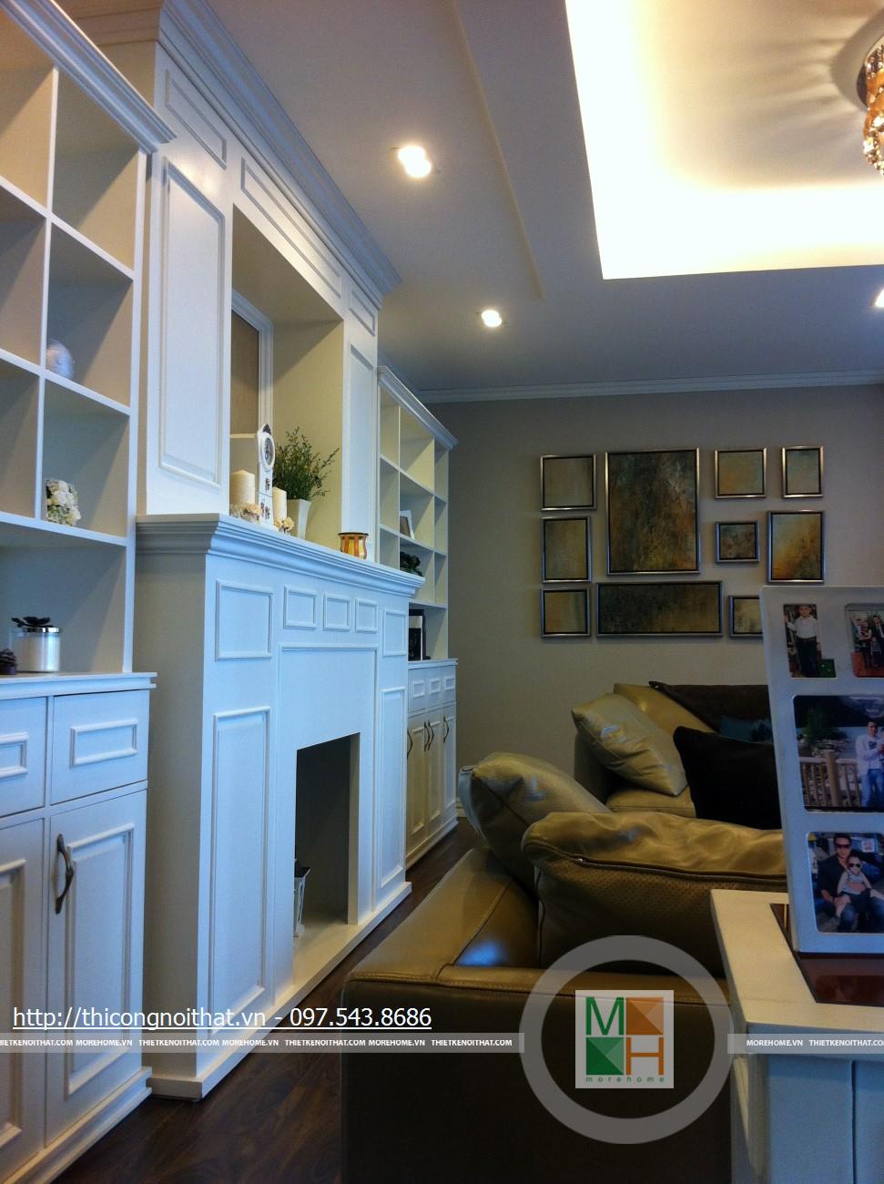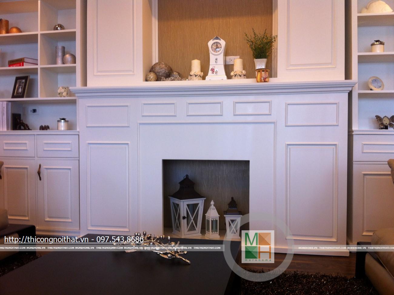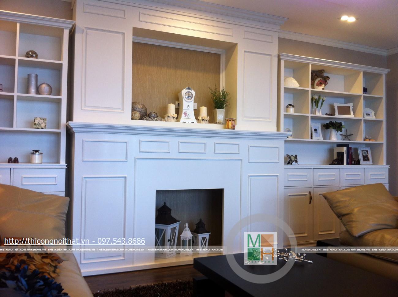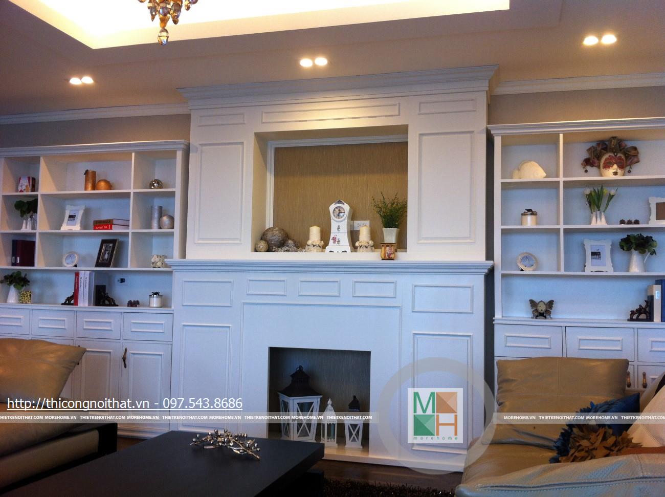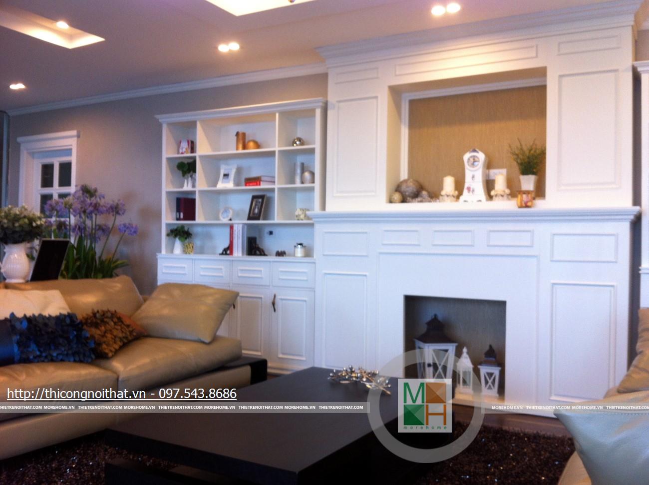 Hai bên chiếc tủ này là 2 kệ đựng đồ với những ngăn ô nhỏ giúp phân chia khu vực đặt đồ trang trí và ở dưới là ngăn tủ kín đựng các vật dụng không muốn trưng bày ra ngoài. Ngay cạnh chiếc ghế bành sofa dài là chiếc bàn trắng nhỏ trên có đặt lọ hoa xinh xắn với các bức tranh lưu niệm. Toát lên trên toàn bộ phòng khách là màu trắng tinh khôi song được tạo điểm nhấn bởi màu sắc của hoa, của bàn ghế, của những chiếc gối ôm.