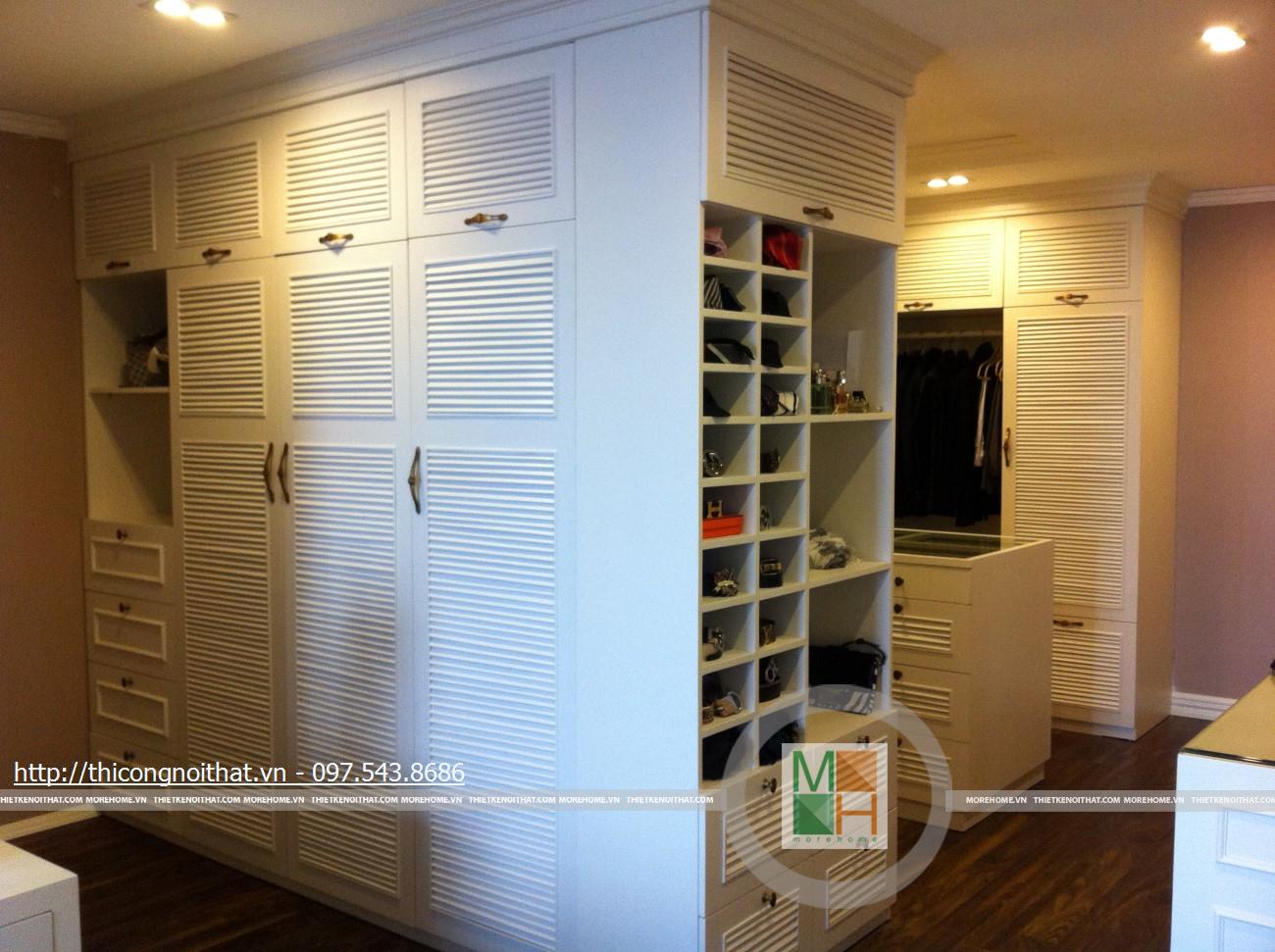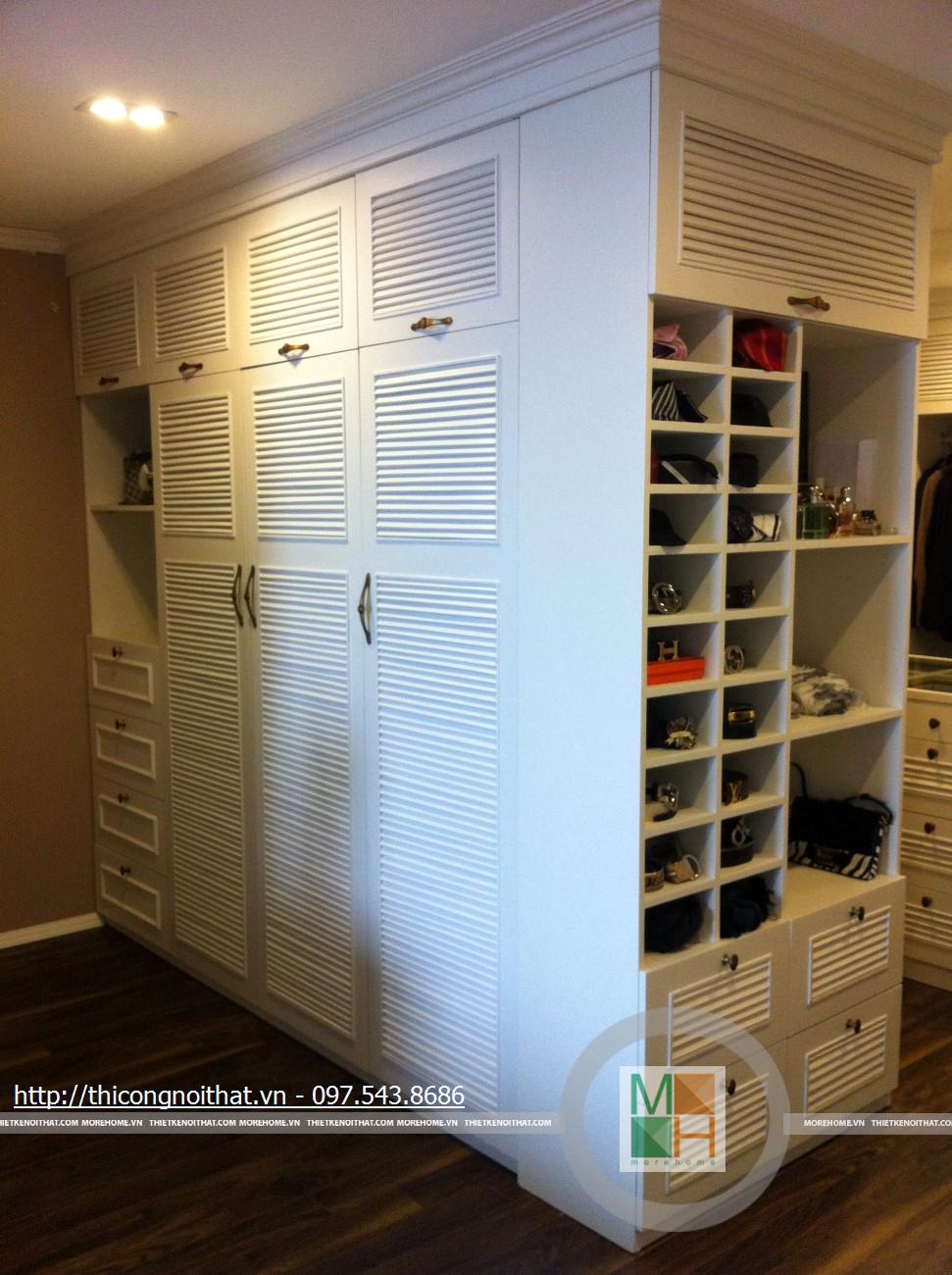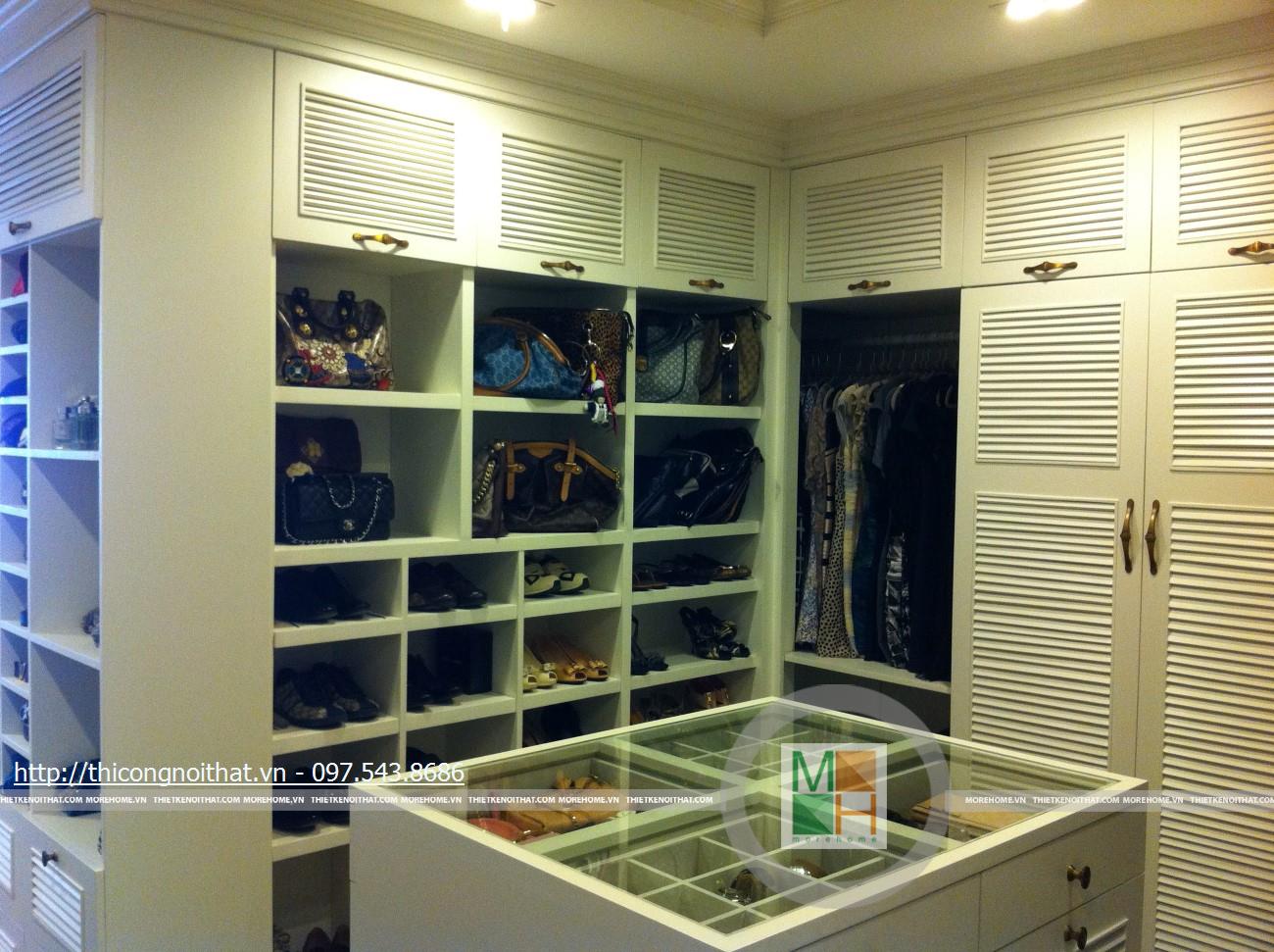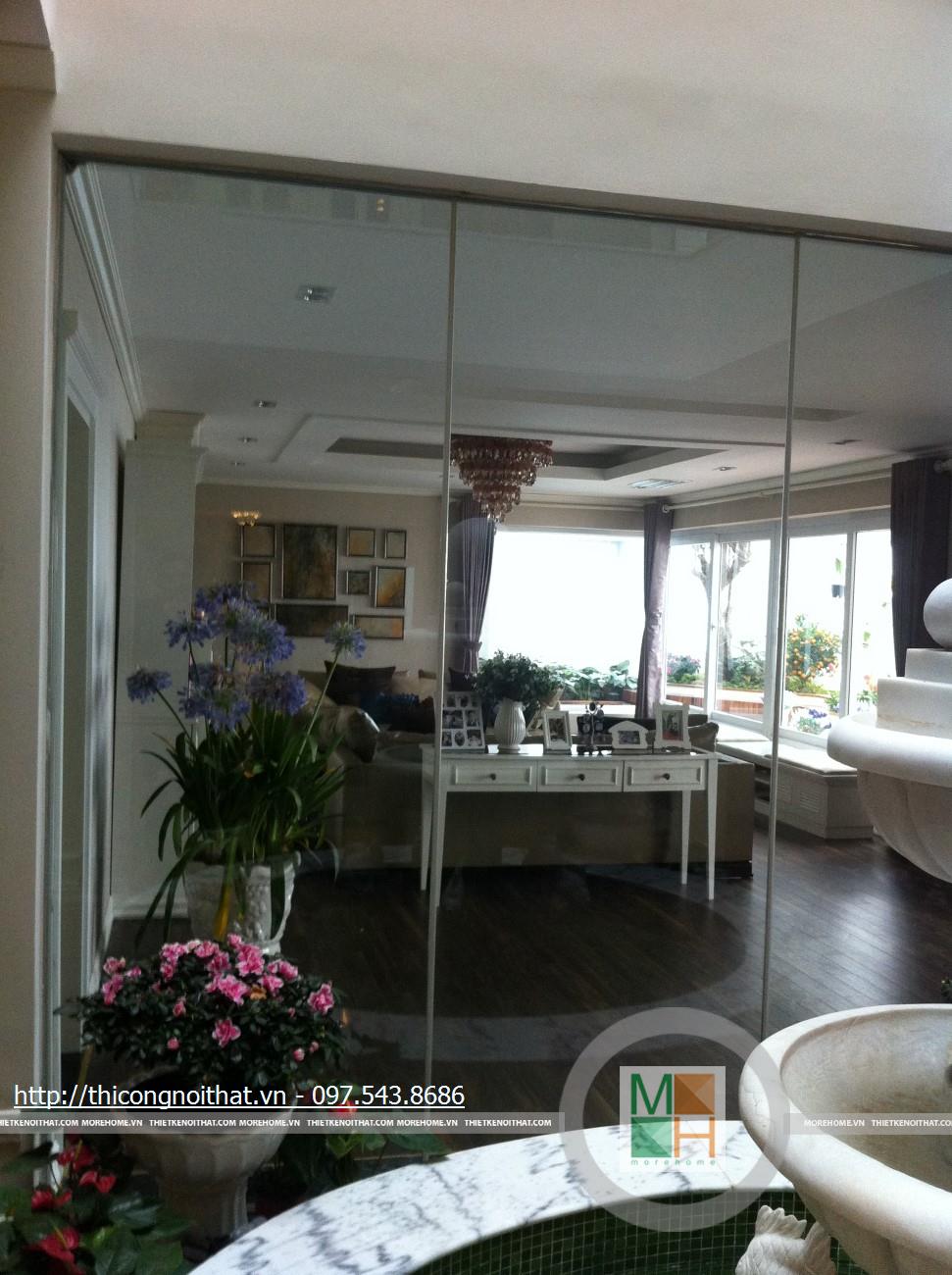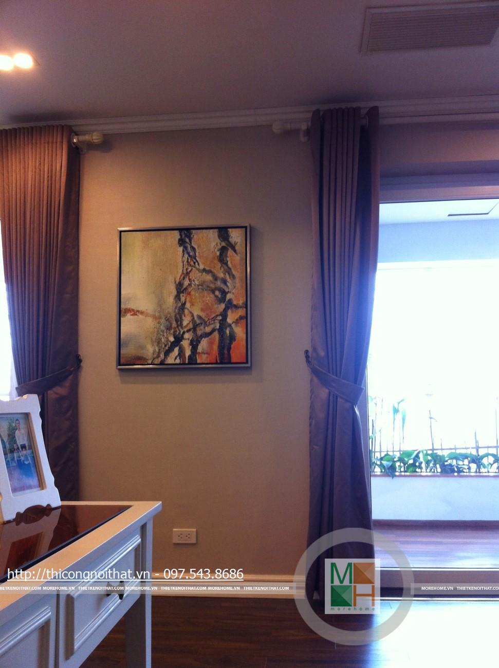 Hai bên chiếc tủ này là 2 kệ đựng đồ với những ngăn ô nhỏ giúp phân chia khu vực đặt đồ trang trí và ở dưới là ngăn tủ kín đựng các vật dụng không muốn trưng bày ra ngoài. Ngay cạnh chiếc ghế bành sofa dài là chiếc bàn trắng nhỏ trên có đặt lọ hoa xinh xắn với các bức tranh lưu niệm. Toát lên trên toàn bộ phòng khách là màu trắng tinh khôi song được tạo điểm nhấn bởi màu sắc của hoa, của bàn ghế, của những chiếc gối ôm.