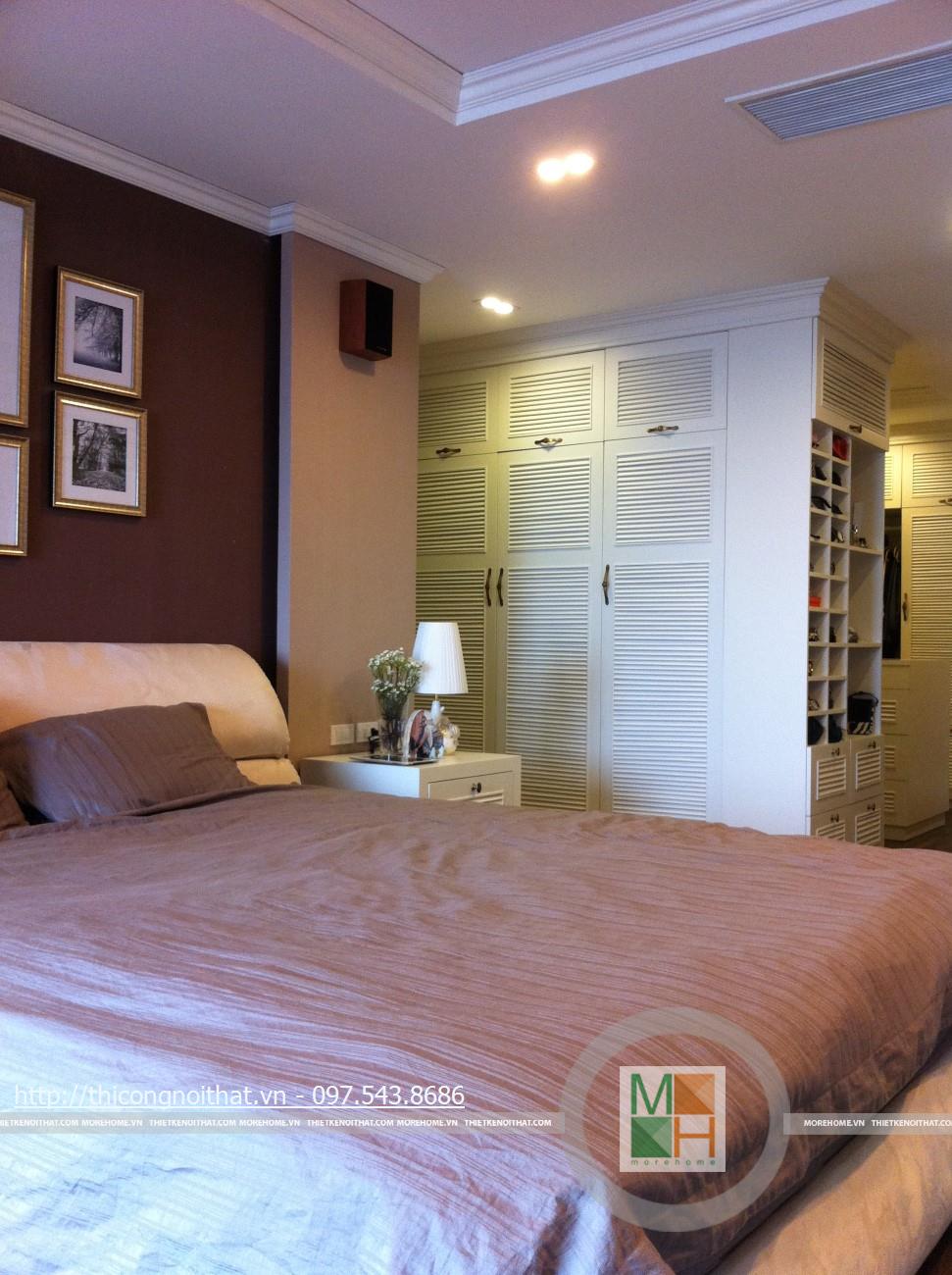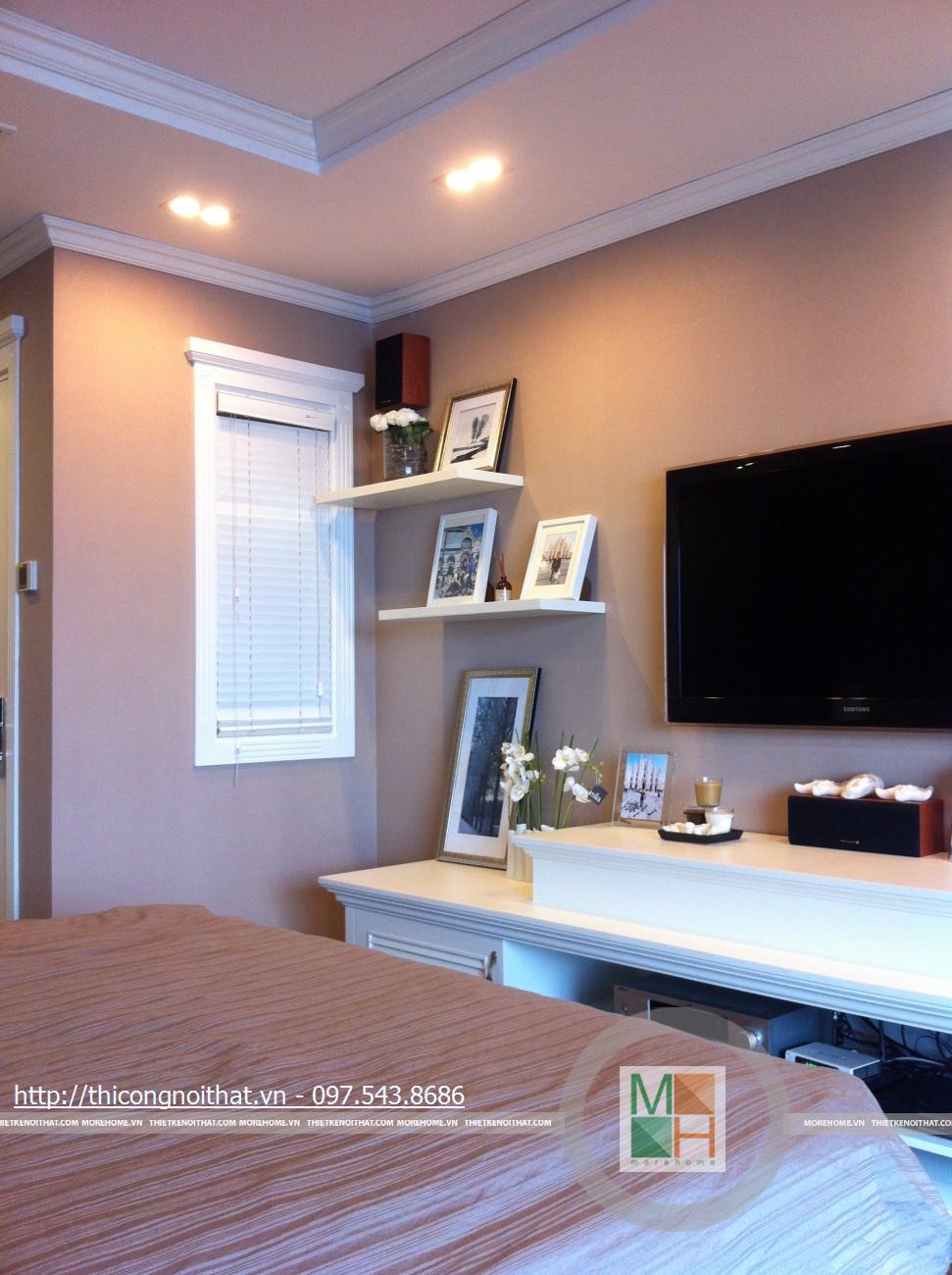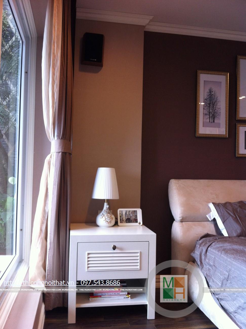 Không giống như bất cứ ngôi nhà hay bất cứ không gian phòng ngủ nào khác, nơi đây có sự mới lạ trong thiết kế và cách bài trí đồ đạc, khung cảnh. Đầu tiên phải kể đến là sự xuất hiện của kệ đựng đồ đặt 2 bên ti vi. Nói là kệ nhưng thực ra nó có thiết kế cực kì đơn giản với 2 bậc ngăn đặt song song và so le 2 bên. Chính sự đơn giản này lại khiến nhiều người chú ý hơn cả và cũng là nét độc đáo riêng trong gu thẩm mỹ của gia chủ.