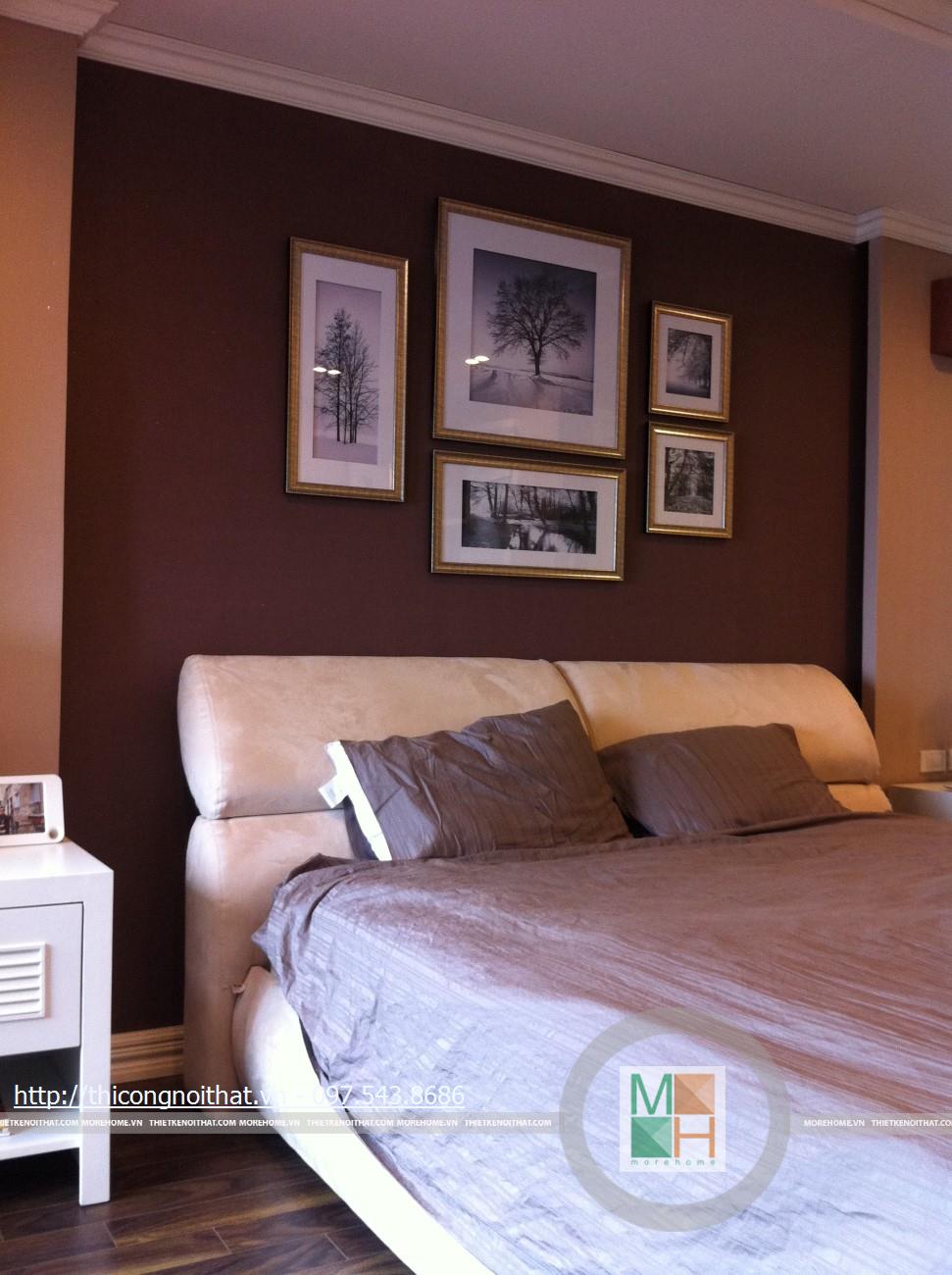 Những bức tranh bắt mắt lại 1 lần nữa xuất hiện trong không gian phòng ngủ. Vẫn là những bức tranh đủ kiểu dáng nhưng ở đây nó có cùng chủ đề về thiên nhiên, cây cối, phong cảnh và được đặt cân xứng ngay trên đầu giường. Màu nâu, màu xám, màu trắng là những gam màu chủ đạo trong phòng ngủ tạo nên sự sinh động và cảm giác ấm cúng mỗi khi bước vào đây.