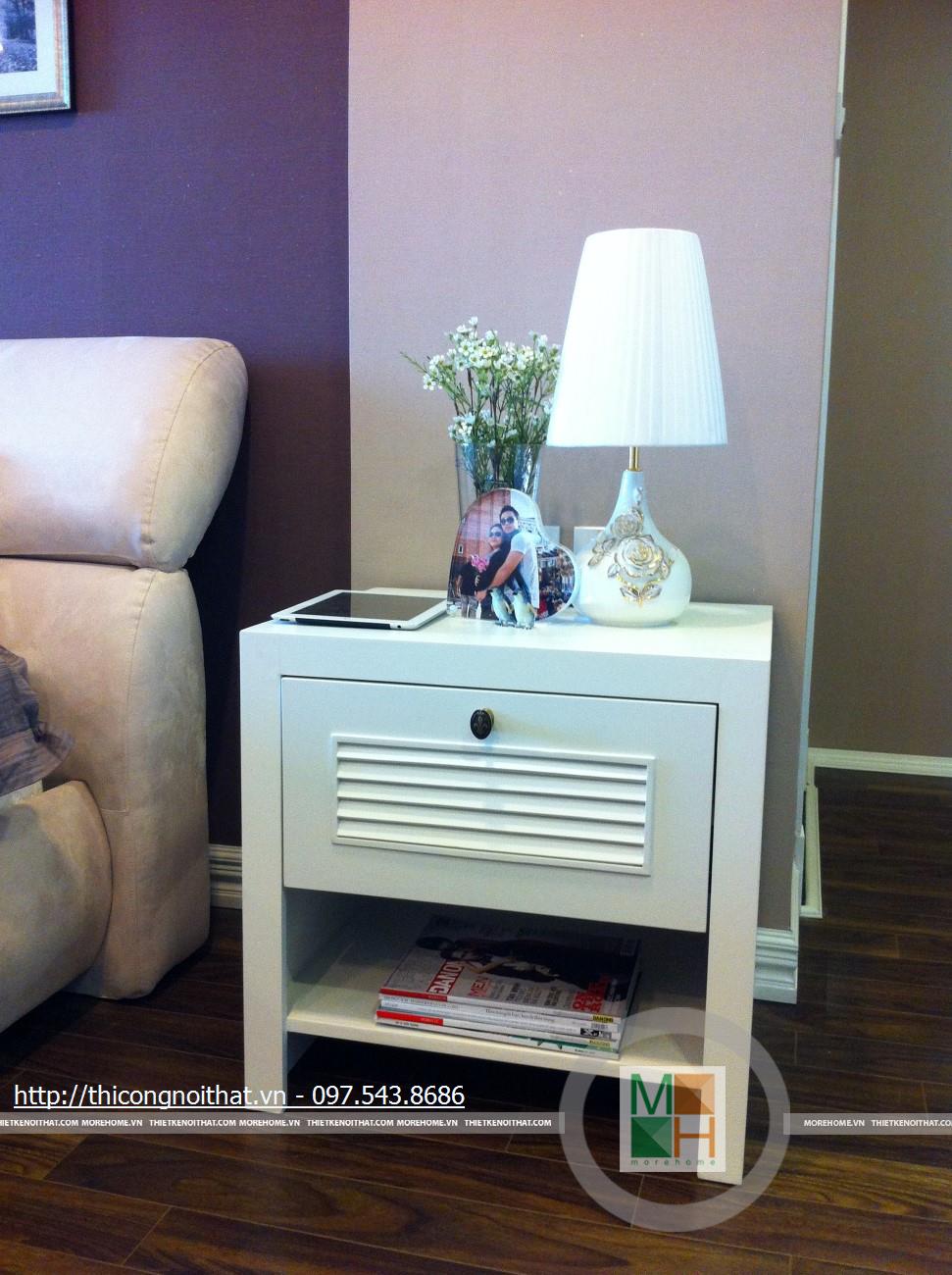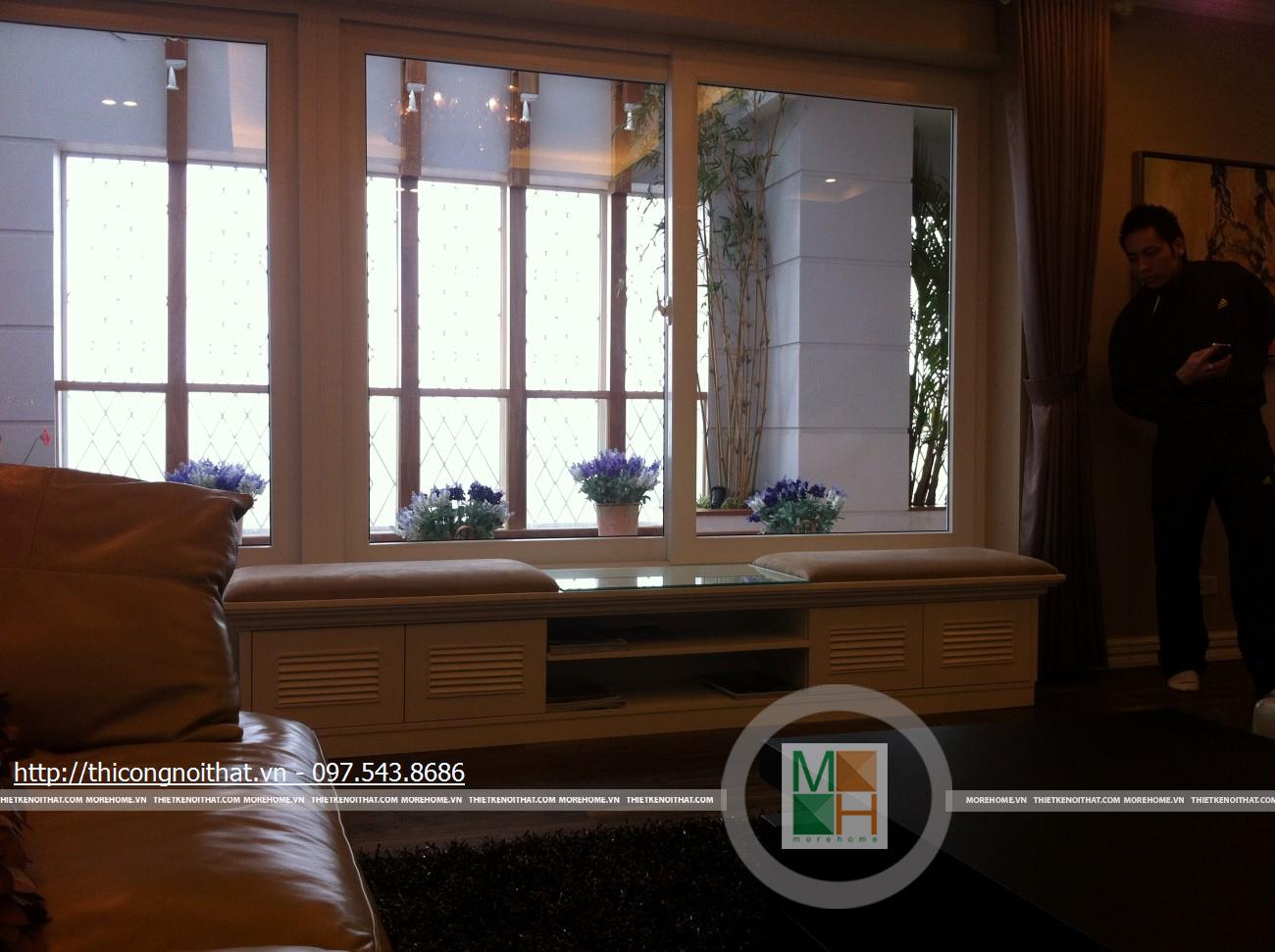 Chiếc bàn gỗ màu nâu đen được đặt ở giữa 2 bên ghế có thiết kế không thể đơn giản hơn. Sự phối kết hợp của bộ sofa và chiếc bàn gỗ này tạo nên sự mới lạ và ấn tượng rất riêng, thể hiện gu thẩm mỹ khác biệt của gia chủ. Nội thất phòng khách còn có sự hiện diện của rất nhiều đồ đạc khác, nó vừa có chức năng làm đẹp, vừa phục vụ cho nhu cầu sinh hoạt của gia chủ. Đó là chiếc tủ và kệ đựng đồ đặt 2 bên tủ, tất cả đều có màu trắng nhẹ nhàng. Điều đặc biệt ở đây là chiếc tủ đựng đồ có thiết kế không giống như bất cứ chiếc tủ nào. Nếu theo lẽ thường tủ sẽ có các ngăn đựng đồ ở dưới và trên đặt ti vi song chiếc tủ này không thế. Tủ này có phía dưới cũng là ngăn tủ nhưng lại có khoảng trống ở giữa để tạo điểm nhấn. Thẳng lên trên khoảng trống này cũng là 1 khoảng trống nữa nhưng to hơn chút để gia chủ có thể chậu hoa nhỏ, đồng hồ, đồ lưu niệm hay các vật trang trí ở đây.
