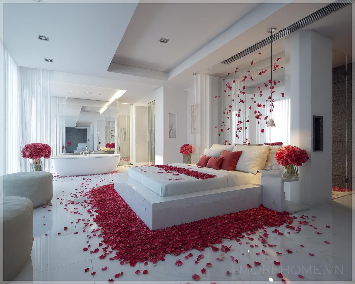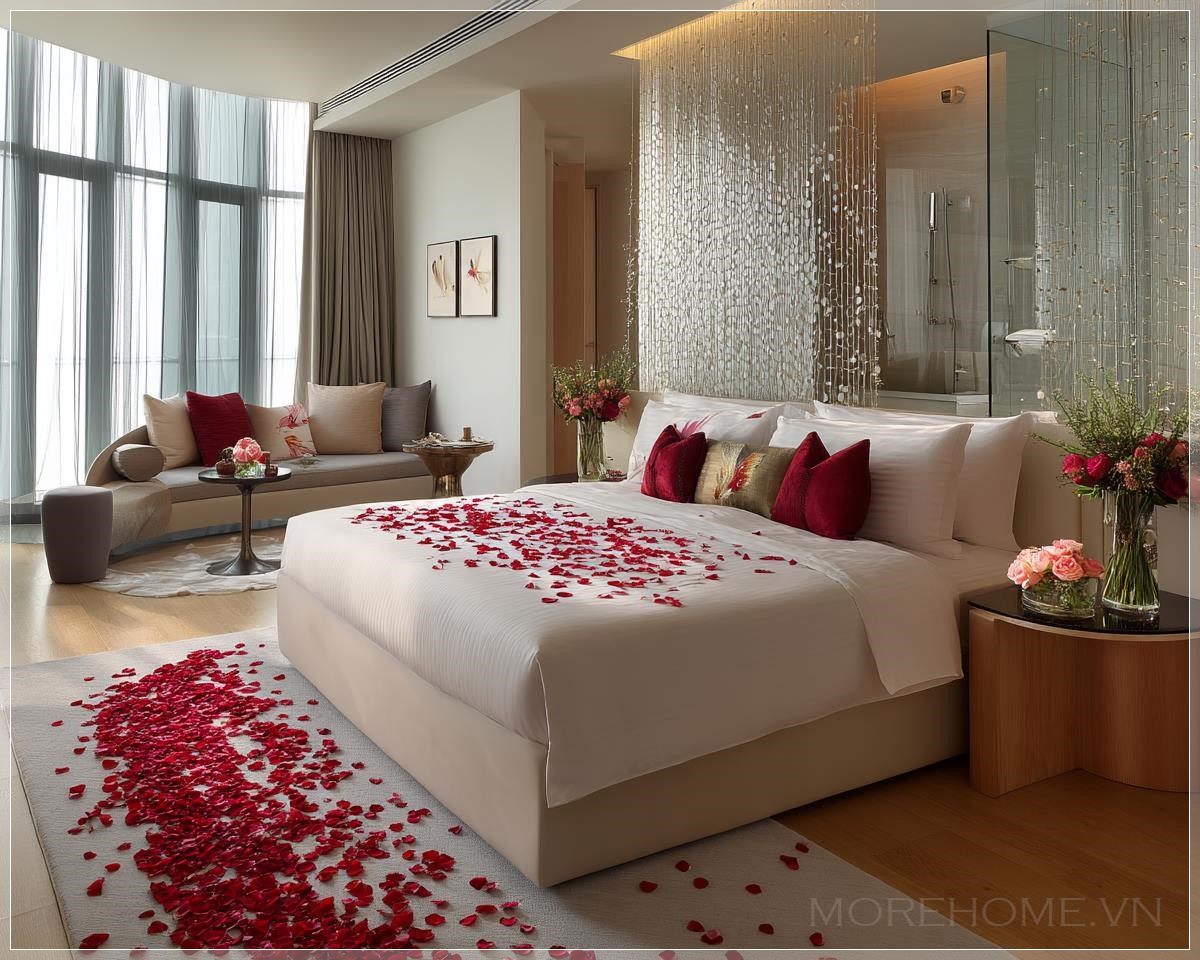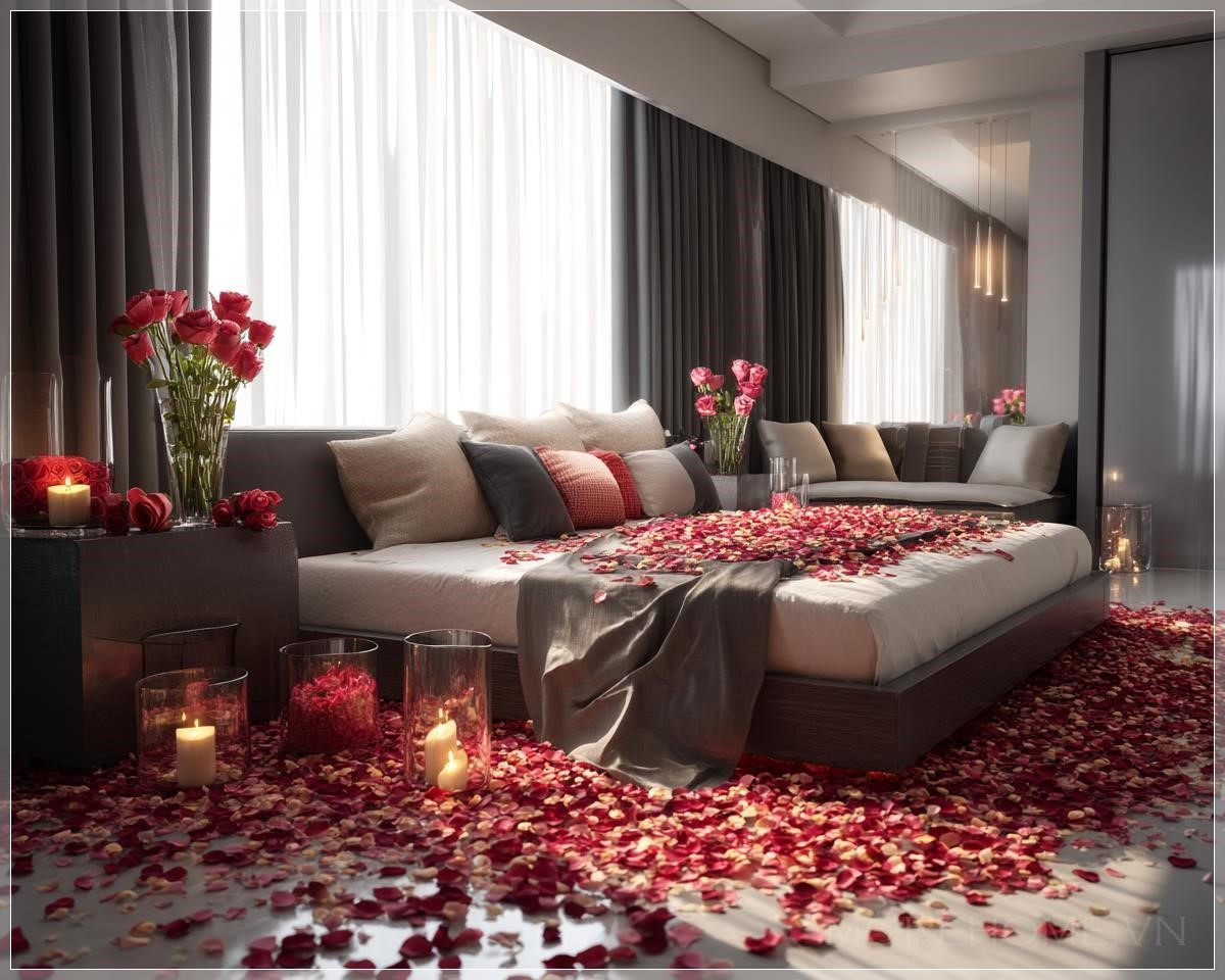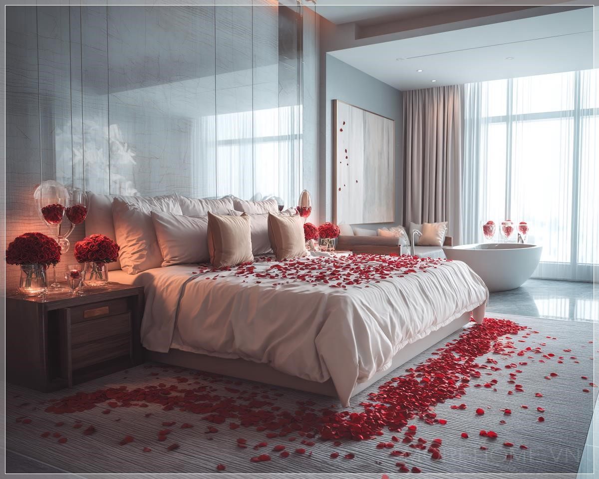 Giường lớn với bộ chăn ga gối sang trọng, được phủ đầy những chiếc gối mềm mại, tạo nên một không gian ấm cúng và dễ chịu. Những cánh hoa hồng đỏ tươi được rải đều trên giường, khiến mỗi bước đi vào phòng đều như bước vào một câu chuyện tình yêu cổ tích. Ánh sáng dịu nhẹ từ những chiếc đèn bedside tạo nên một không gian lãng mạn, làm nổi bật vẻ đẹp của những bông hồng tươi thắm trong những chiếc lọ hiện đại trên các bàn cạnh giường.