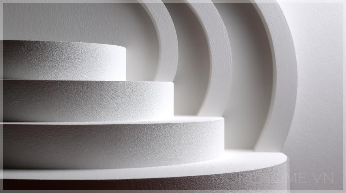 Một trong những đặc điểm nổi bật của trang trí tường tròn là sự kết hợp hoàn hảo giữa hình học đơn giản và màu sắc nhẹ nhàng. Những chiếc tường tròn này không chỉ là điểm nhấn về thẩm mỹ mà còn giúp tạo ra không gian thư giãn, giúp bạn cảm thấy dễ chịu và thoải mái. Chính sự mượt mà của đường cong cùng với sự trong trẻo của màu trắng khiến cho không gian trở nên mở rộng và dễ chịu.