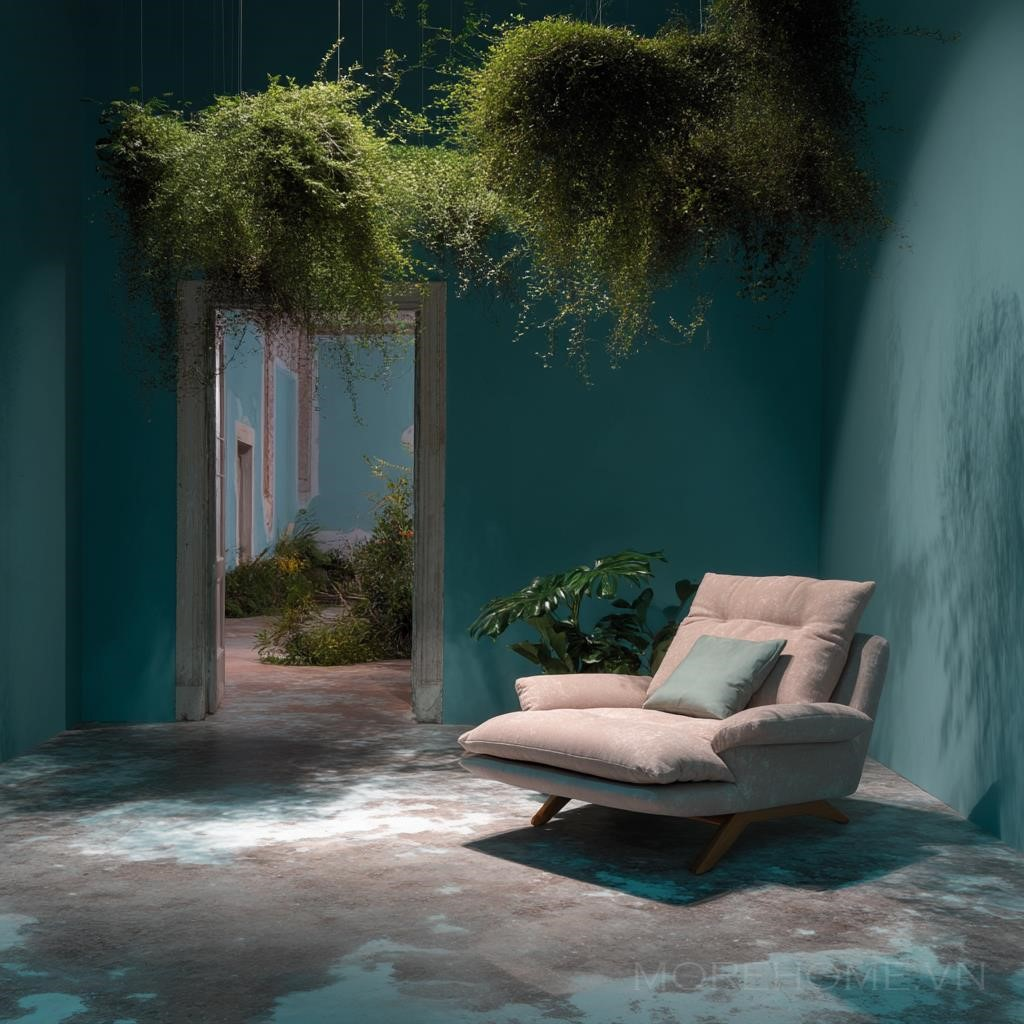 Trong không gian rộng 5x5 mét, một chiếc ghế Moroso đặc biệt thu hút ánh nhìn ngay khi bước vào. Chiếc ghế này không chỉ là một món đồ nội thất mà còn là một tác phẩm nghệ thuật độc đáo. Được treo lơ lửng giữa không gian, ghế như đang bay bổng, được nâng đỡ bởi những sợi dây thường xuyên quấn quanh các tán lá xanh tươi của cây thường xuân. Đây là một thiết kế mang tính đột phá, kết hợp giữa sự thanh thoát của thiên nhiên và vẻ đẹp hiện đại của nội thất đương đại.