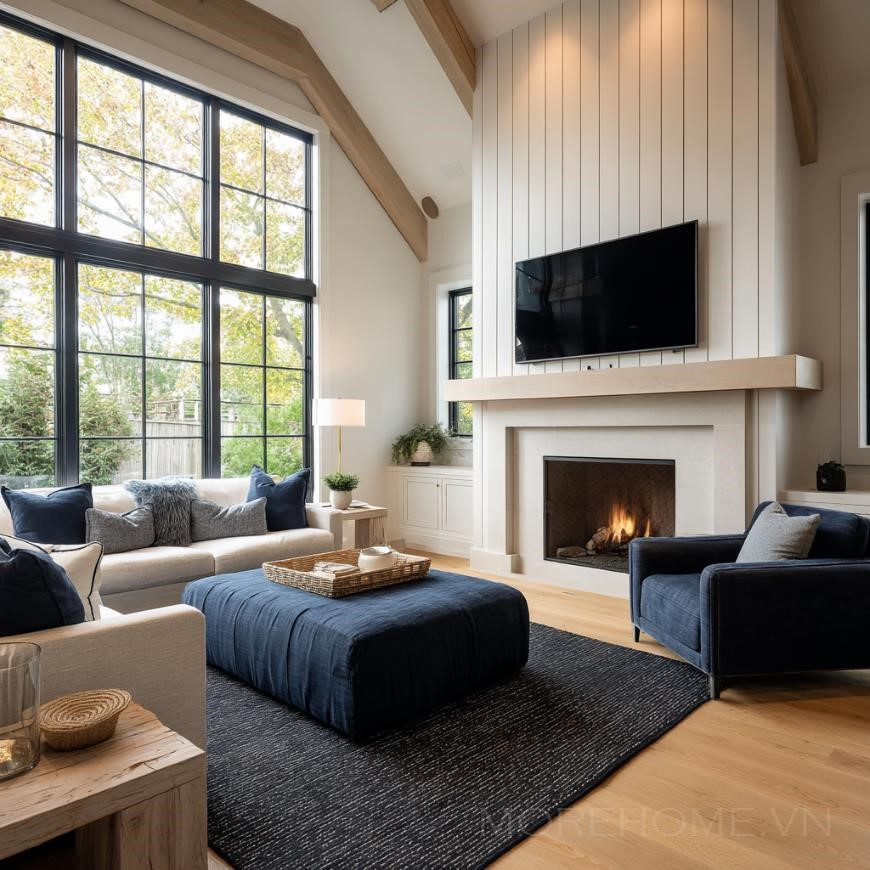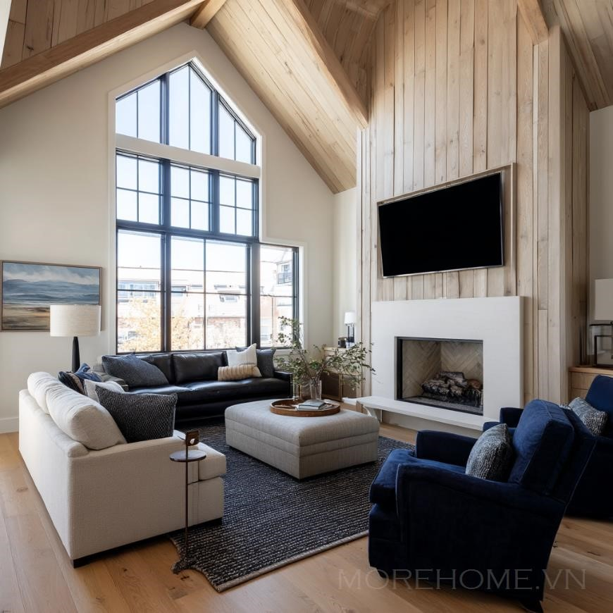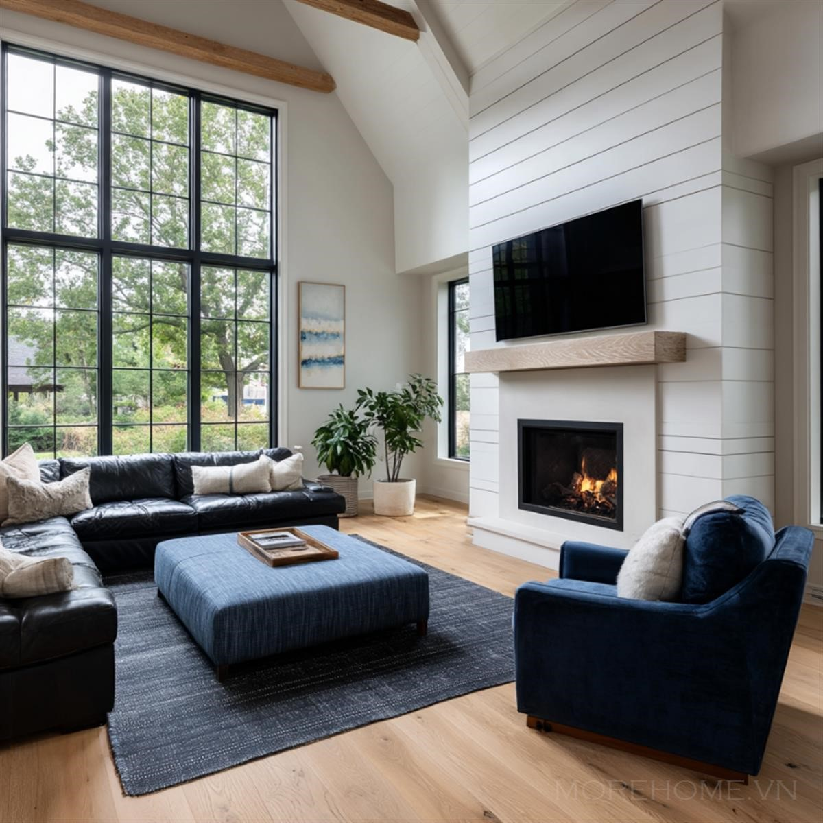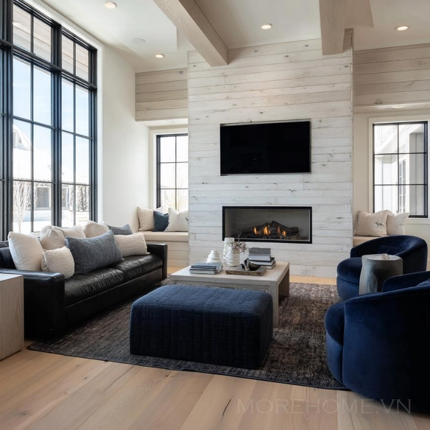 Trung tâm của căn phòng là chiếc lò sưởi ấm áp, trên đó được đặt một chiếc TV lớn, trở thành điểm nhấn nổi bật cho không gian. Những bức tường được trang trí bằng các thanh gỗ shiplap, mang đến một cảm giác cổ điển nhưng không kém phần hiện đại. Ánh sáng tự nhiên từ những cửa sổ lớn chiếu vào, khiến không gian càng thêm phần thoáng đãng và đầy sức sống.