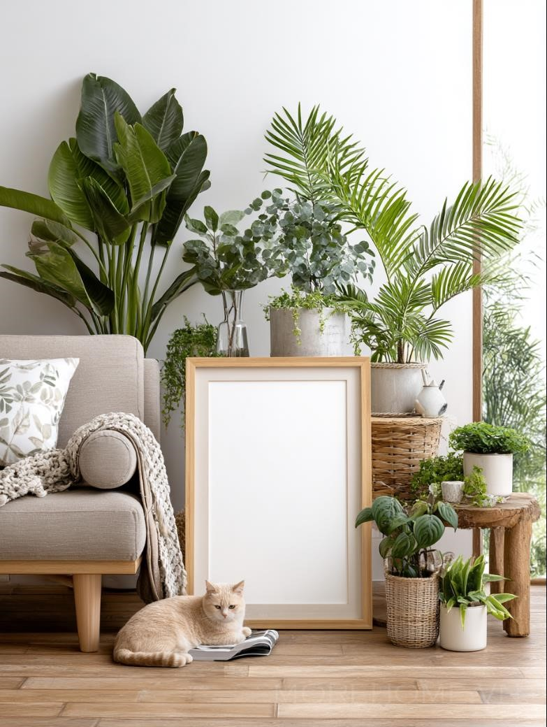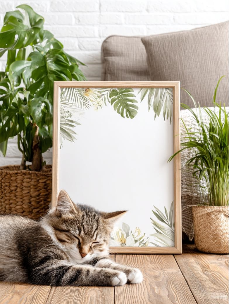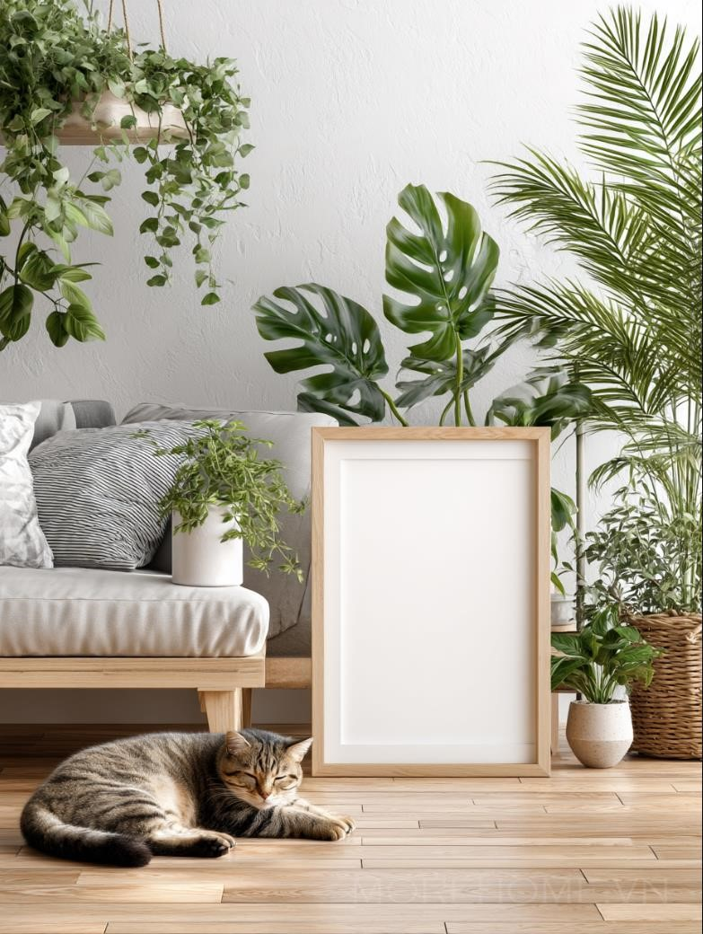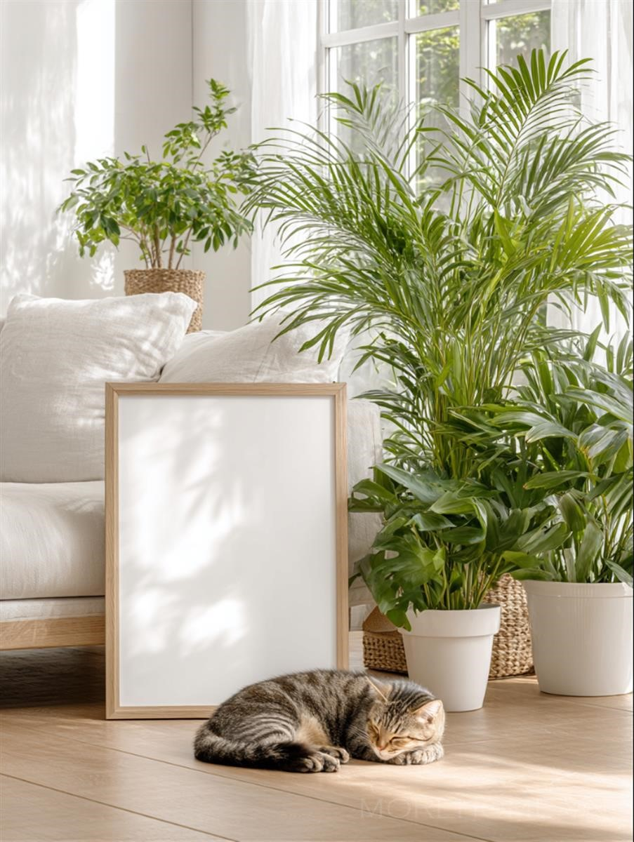 Trong một không gian phòng khách hiện đại, một bức tranh với tỷ lệ 3:4 đặt trên sàn gỗ đã tạo ra một điểm nhấn tinh tế. Khung hình dựa vào tường, nổi bật giữa nền trắng của căn phòng, mang đến cảm giác thanh thoát và dễ dàng thay đổi tùy theo sở thích cá nhân. Không xa khung hình, một chú mèo dễ thương và lười biếng đang say ngủ trên sàn gỗ, tạo ra một không gian yên bình và ấm áp. Bên cạnh đó, chiếc sofa đơn giản và cửa sổ mở rộng giúp không gian thêm phần thoáng đãng, kết hợp cùng những cây xanh tạo nên sự hòa quyện hoàn hảo giữa thiên nhiên và thiết kế nội thất.