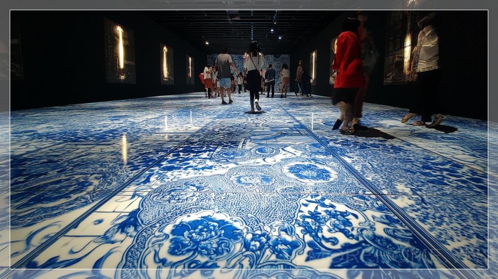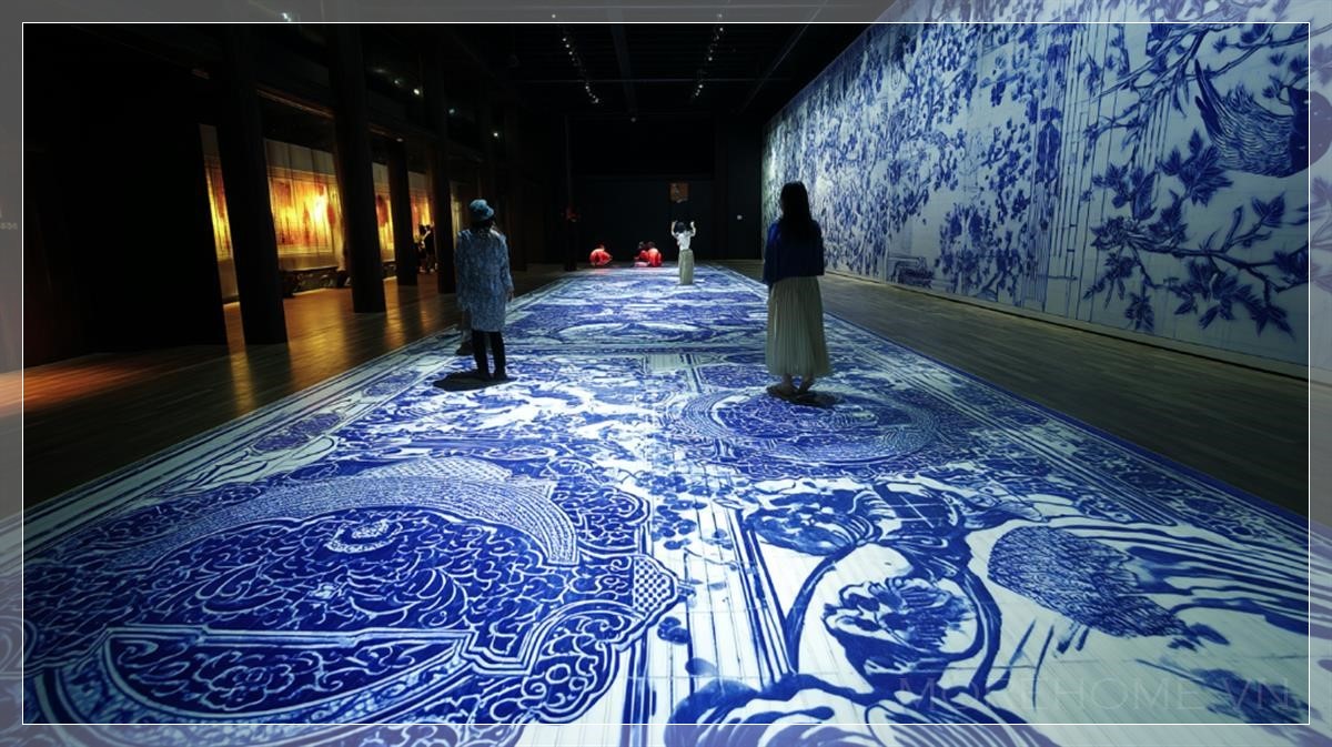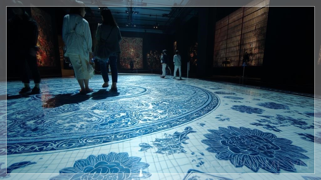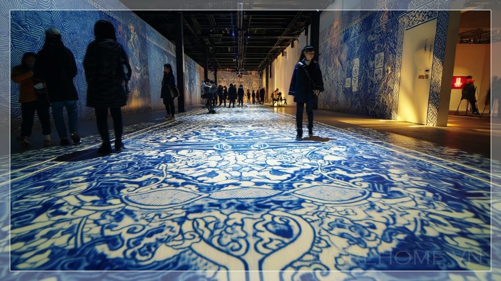 Trong không gian tối tăm, nơi ánh sáng duy nhất phát ra từ những họa tiết porcelain Trung Hoa xanh trắng trên sàn, bức tranh sống động này tạo ra một bầu không khí huyền bí nhưng đầy năng lượng. Những người tham gia đứng trên mặt đất, hòa mình vào các trò chơi tương tác được chiếu trực tiếp lên nền sàn, như thể họ đang bước vào một câu chuyện cổ xưa, nhưng lại gắn liền với một trải nghiệm hiện đại và đầy thú vị.