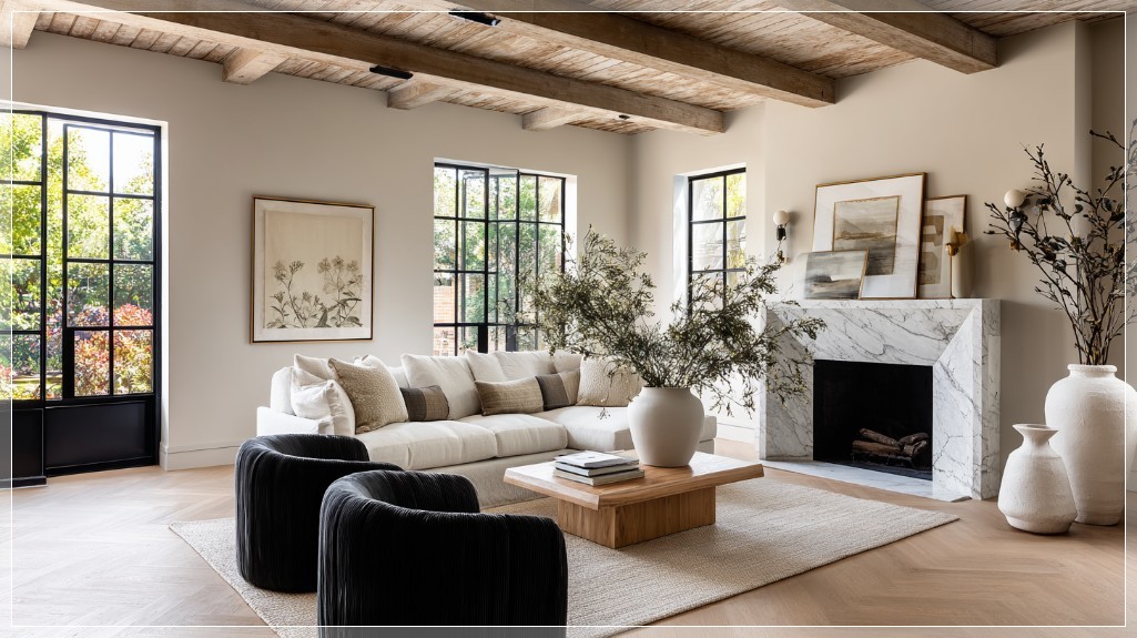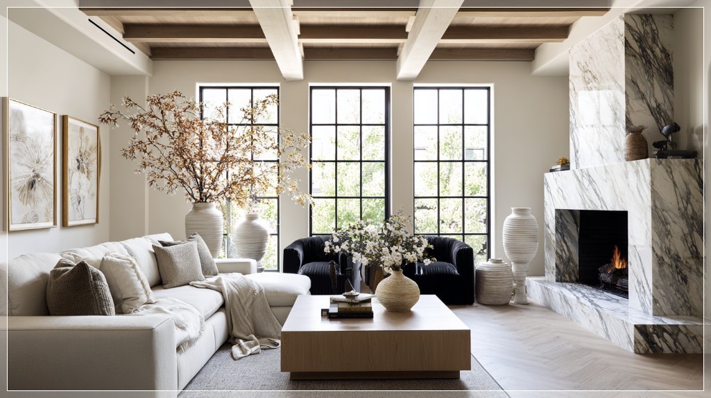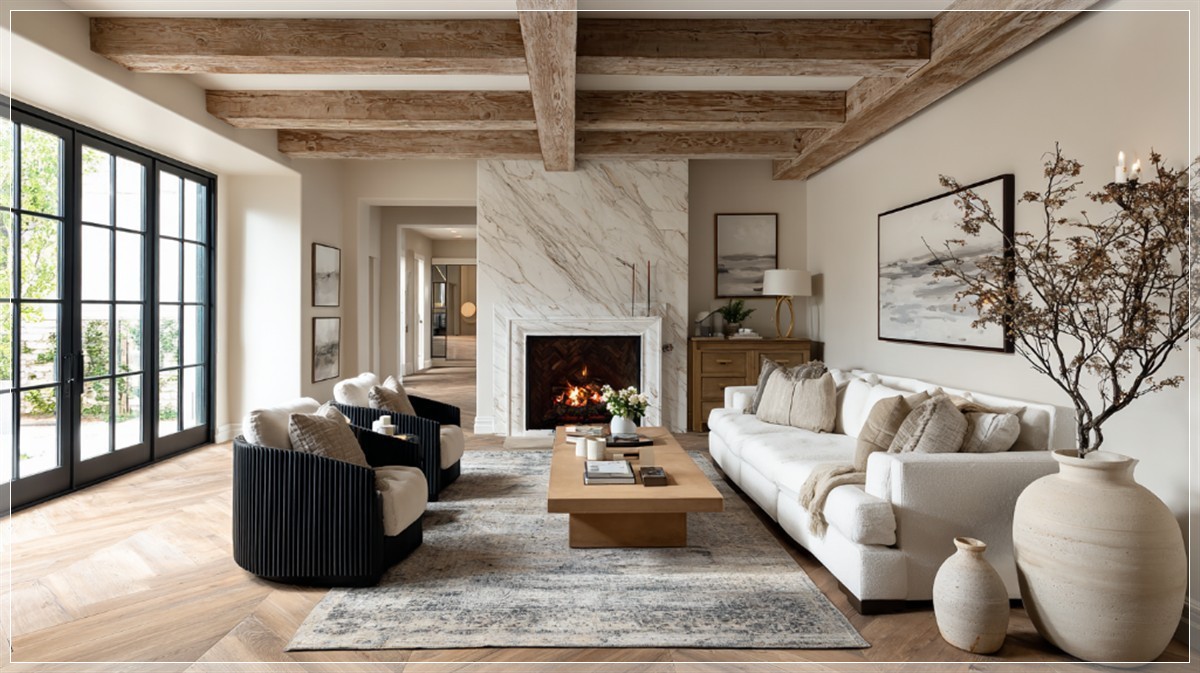 Ấn tượng đầu tiên đến từ lò sưởi ốp đá marble Viola Calacatta – tâm điểm sang trọng của toàn bộ không gian. Vân đá tím pha kem nhẹ nhàng, vừa nổi bật lại vừa hòa hợp với tổng thể. Trần nhà được gia cố bằng các dầm gỗ sồi tự nhiên, gợi nhắc đến tinh thần kiến trúc farmhouse nguyên bản. Phía dưới là nền sàn xương cá gỗ sồi, tạo hiệu ứng thị giác mềm mại nhưng vẫn vững chãi, nâng đỡ mọi lớp chất liệu phía trên.