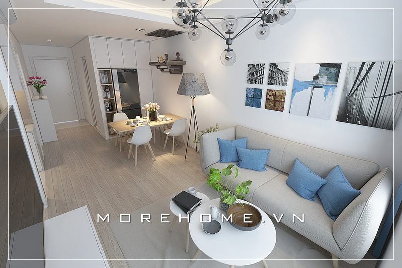 Thiết kế phòng khách chung cư liền bếp tạo sự liền mạch với đồ nội thất gỗ óc chó kết hợp cùng gỗ sơn trắng tạo vẻ đẹp hiện đại độc đáo cho phòng khách căn hộ.