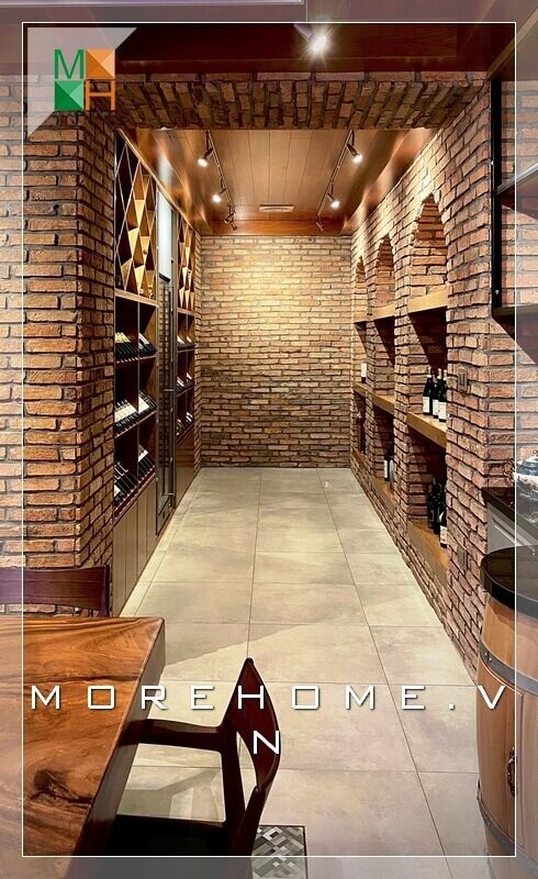 Ấn tượng với thiết kế phòng rượu hiện đại với những cái kệ gỗ âm tường thiết kế để lộ gạch ngoài độc đáo và lạ mắt.