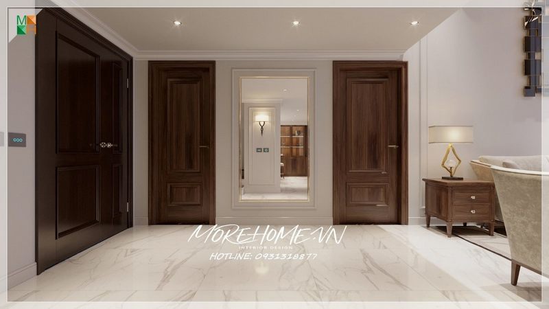 Đẳng cấp - ấn tượng- sang trọng là những gì bạn có thể cảm nhận được trong mẫu thiết kế nội thất phòng khách biệt thự, nhà phố từ gỗ óc chó nâu quý trên đây của MoreHome