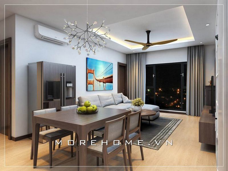 Thiết kế nội thất đẹp cho phòng khách căn hộ chung cư bao gồm liền bếp ăn.