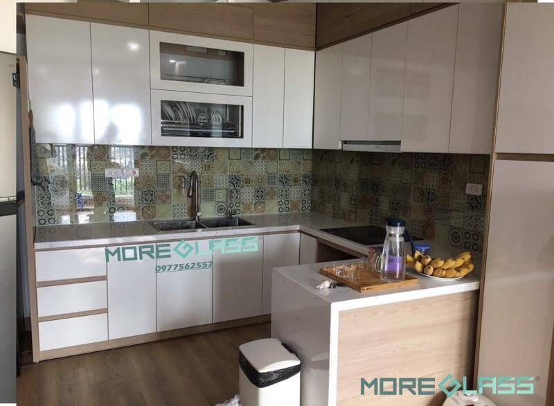 Mẫu thiết kế kính ốp bếp hoa văn họa tiết Mosaic, phù hợp với những không gian đơn giản, thanh lịch, khiến cho căn bếp của bạn trông rực rỡ sống động hơn