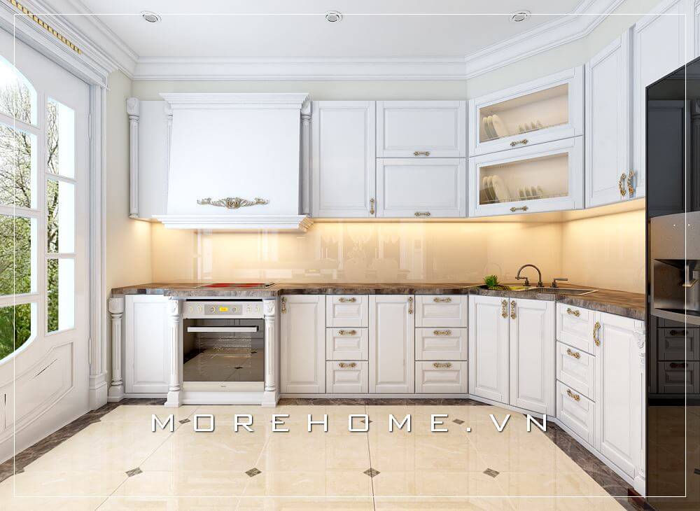 Thiết kế phòng bếp biệt thự tân cổ điển sang trọng kết hợp nội thất bếp hiện đại tạo không gian nấu nướng rộng và thoáng mát hơn.